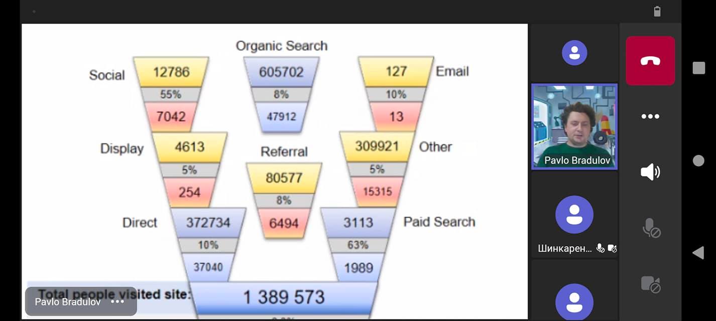 Павло розповів яким чином застосовуються в компанії інструменти Google-аналітики, а саме: як побудувати систему метрик, зберігати дані, об'єднувати дані з різних джерел, перевіряти гіпотези за допомогою А/В - тестів через Google Optimize та створювати систему наскрізної аналітики. Гостру дискусію викликали питання ефективності застосування Google аналітики при оцінюванні маркетингових показників різних діджитал каналів.