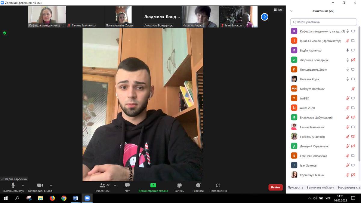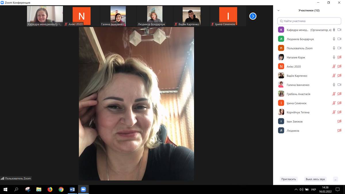 16 лютого 2022 року відбулось засідання робочих груп з розроблення освітніх програм (ОП) «Менеджмент» (молодший бакалавр), «Менеджмент організацій» (бакалавр, магістр), «Менеджмент зовнішньоекономічної діяльності» (бакалавр).