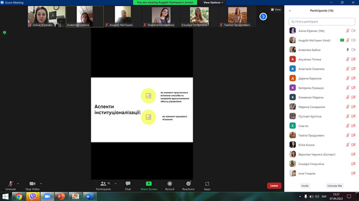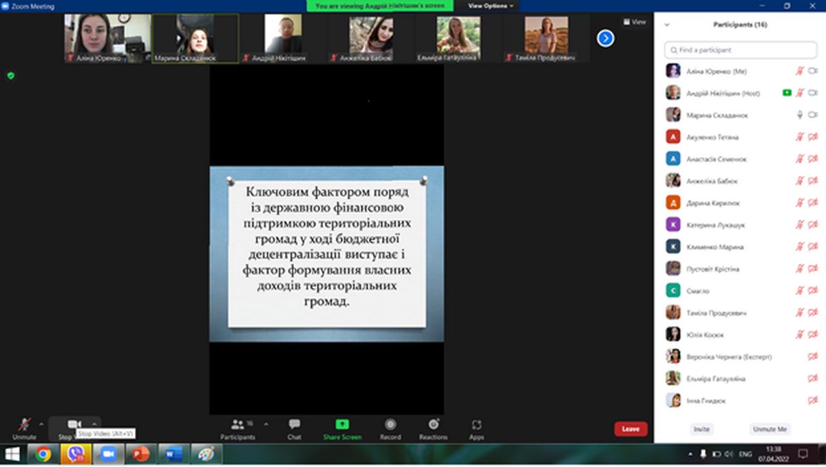 7 квітня 2022 року керівник наукового гуртка д.е.н., доцент, професор кафедри фінансів Нікітішин Андрій Олександрович, завідувач кафедри фінансів к.е.н, доцент Гнидюк Інна Вікторівна та науково-педагогічні працівники кафедри фінансів взяли участь в засіданні наукового гуртка на тему: «Удосконалення системи місцевих фінансів в умовах інституційних перетворень».