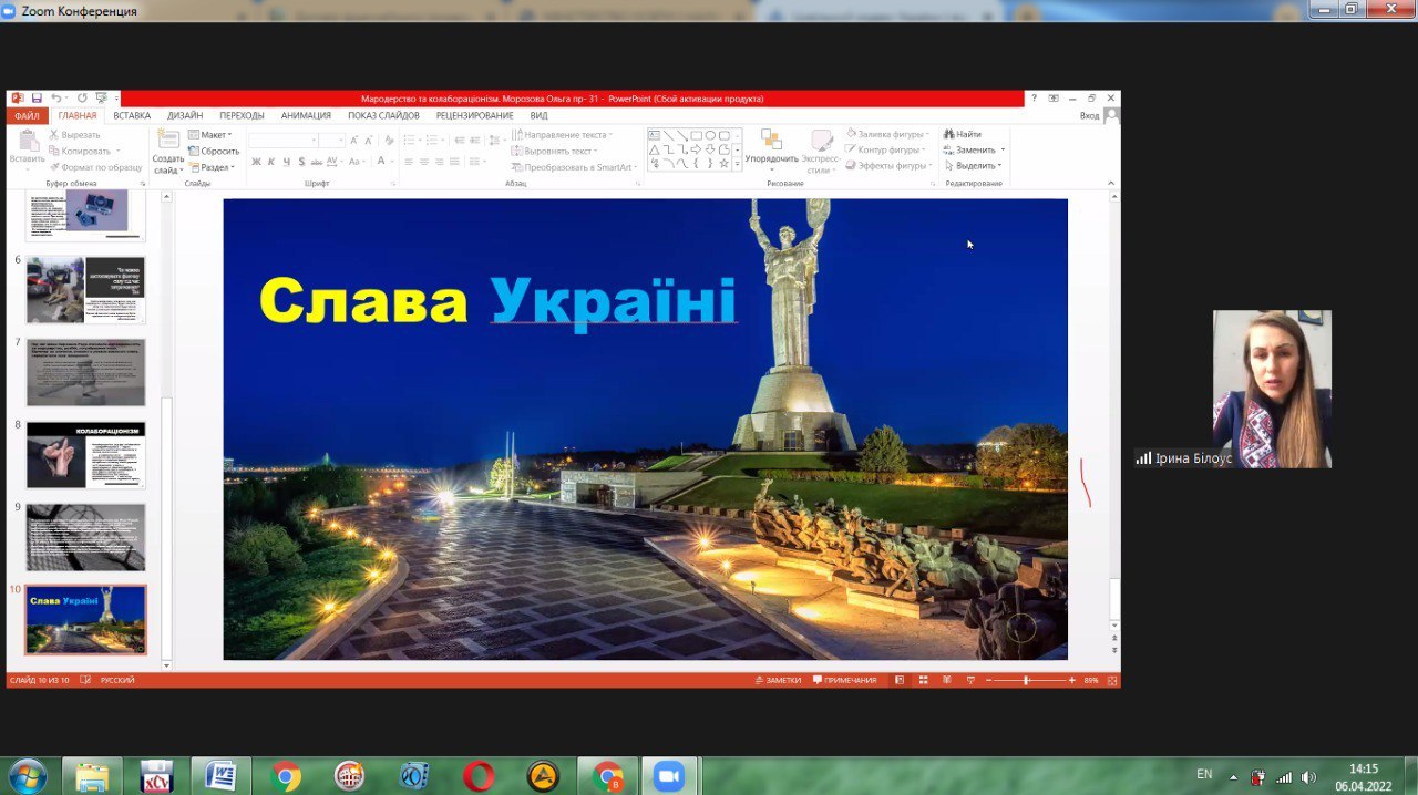 6 квітня 2022 року в режимі онлайн відбулося відкрите засідання наукового гуртка «Феміда» на тему «Кримінальна відповідальність під час воєнного стану» (керівник доцент кафедри права Ірина Білоус).
