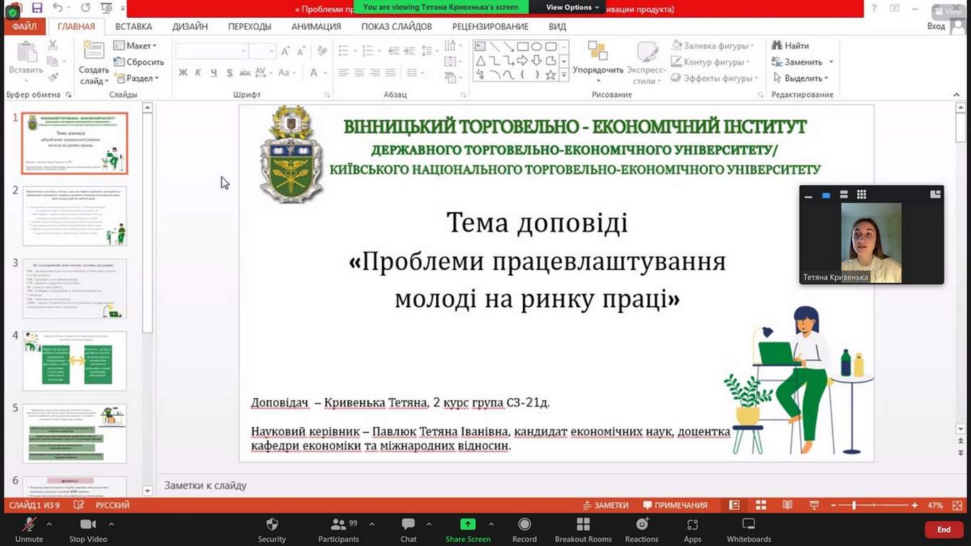- Тетяна Кривенька, студентка 2 курсу, гр. СЗ-21д, спеціальності 232 «Соціальне забезпечення» представила доповідь «Проблеми працевлаштування молоді на ринку праці» (науковий керівник – к.е.н., доцент Тетяна Павлюк);