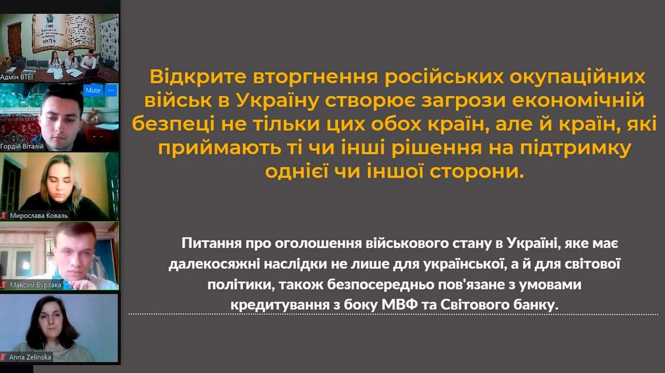 - Анжеліка Бабюк, студентка 4 курсу гр.ФБСС-41д, спеціальності 072 «Фінанси, банківська справа та страхування» з доповіддю на тему «Вплив міжнародних фінансових інституцій на фінансовий сектор України в умовах війни» (науковий керівник – к.е.н., доцент Інна Гнидюк);