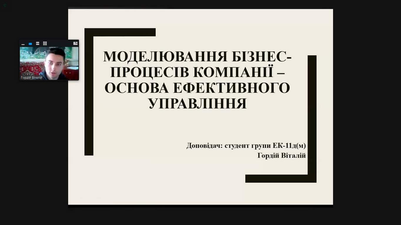 - Віталій Гордій, студент 1 курсу гр. ЕК-11д(м), спеціальності 051 «Економіка» з доповіддю на тему «Моделювання бізнес-процесів компанії – основа ефективного управління» (науковий керівник – к.т.н., доцент Олена Кузьміна);