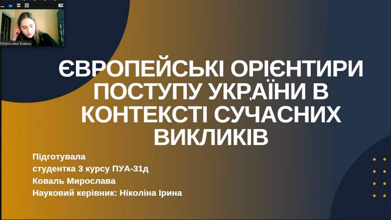 - Мирослава Коваль, студентка 3 курсу гр. ПУА-31д, спеціальності 281 «Публічне управління та адміністрування» з доповіддю на тему «Європейські орієнтири поступу України в контексті сучасних викликів» (науковий керівник – к.н.держ.упр., доцент Ірина Ніколіна);