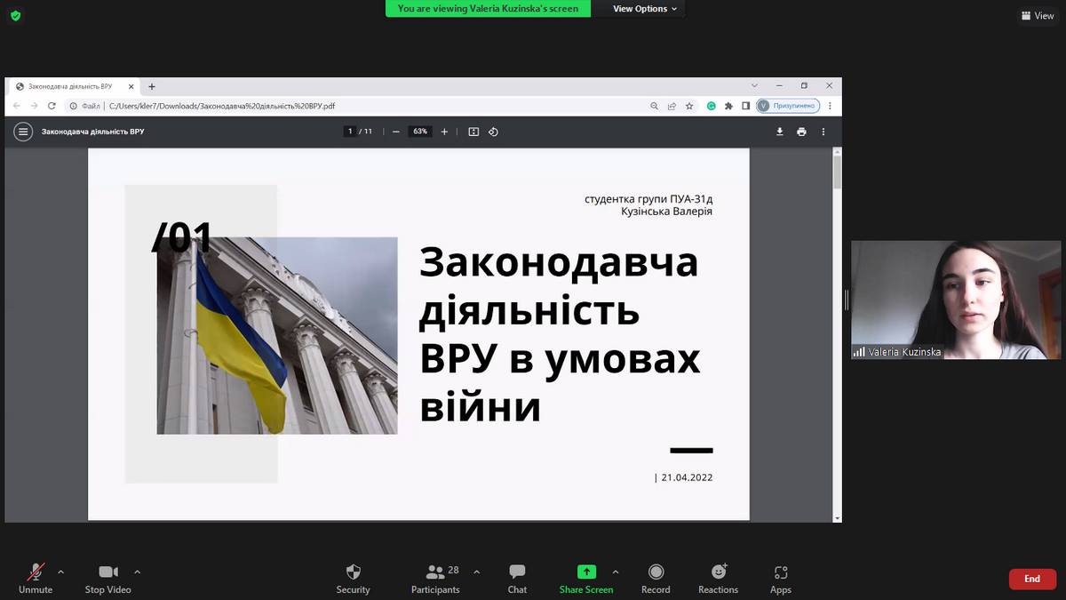 2. Валерія Кузінська, гр. ПУА-31д, доповідь на тему «Законодавча діяльність Верховної Ради України в умовах війни», виконана під науковим керівництвом к.е.н., доцентки Махначової Наталі;