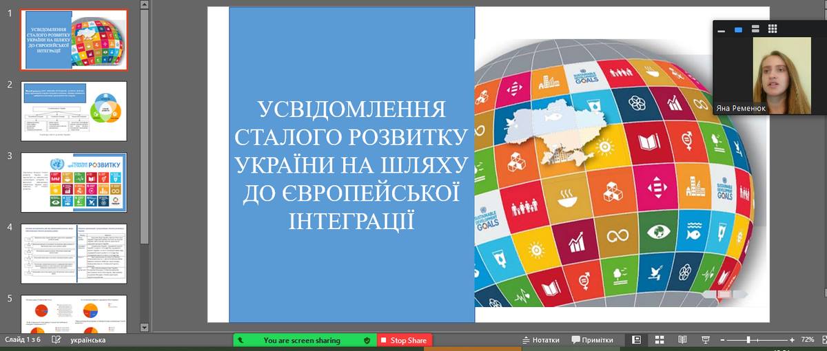 1. Яна Ременюк, гр. ПУА-11д(м), доповідь на тему «Усвідомлення сталого розвитку України на шляху до Європейської інтеграції», виконана під науковим керівництвом к.е.н., доцентки Махначової Наталі;