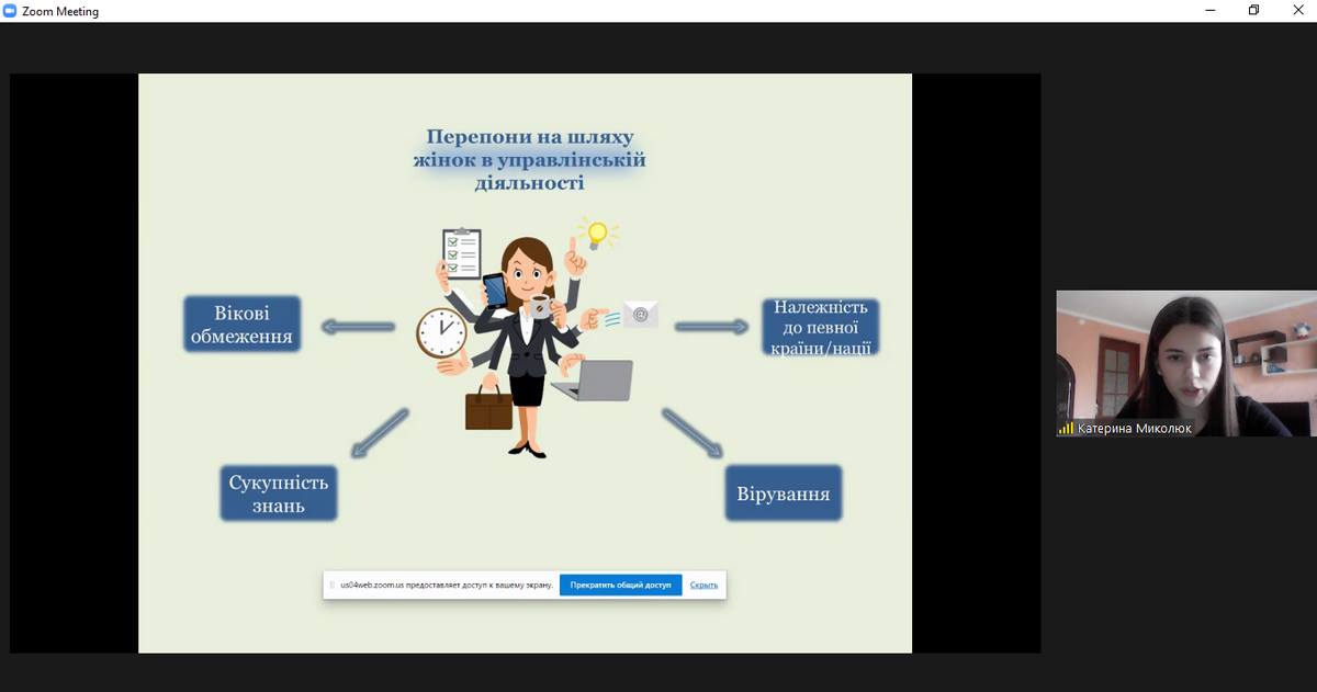 3. Катерина Миколюк, гр. ПУА-41д, доповідь на тему «Гендерні особливості психології особистості та їх вплив на управлінську діяльність», виконана під науковим керівництвом к.е.н., доцентки Махначової Наталі;