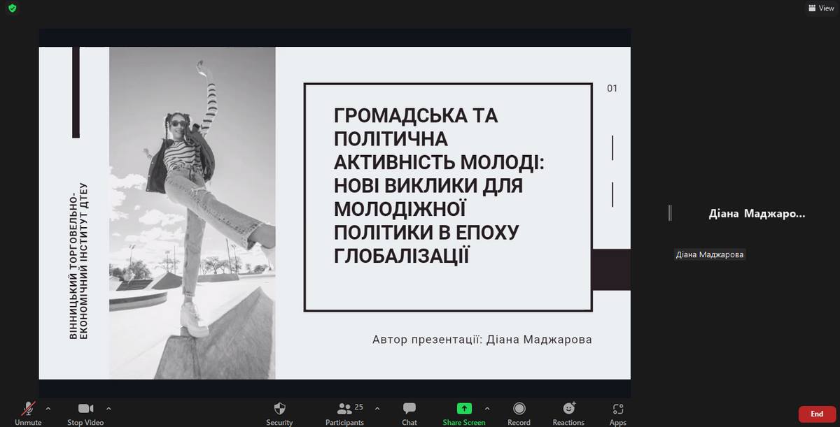 4. Діана Маджарова, гр. ПУА-31д, доповідь на тему «Громадська та політична активність молоді: нові виклики для молодіжної політики в епоху глобалізації», виконана під науковим керівництвом к.е.н., доцентки Семенюк Ірини;