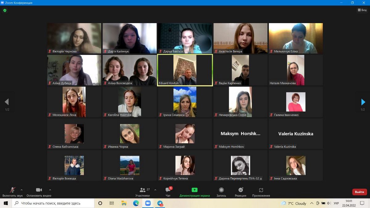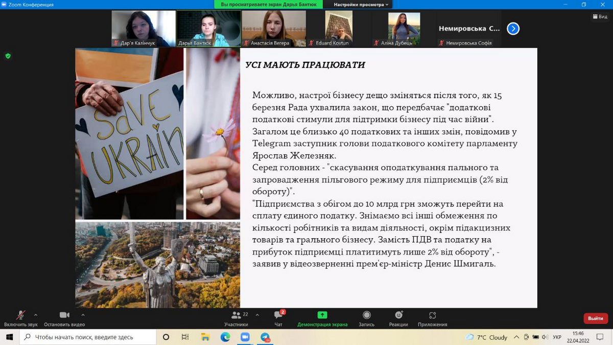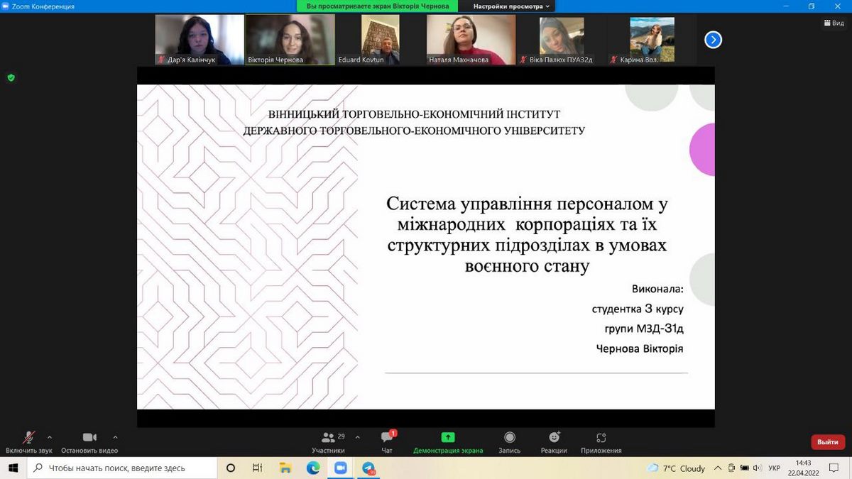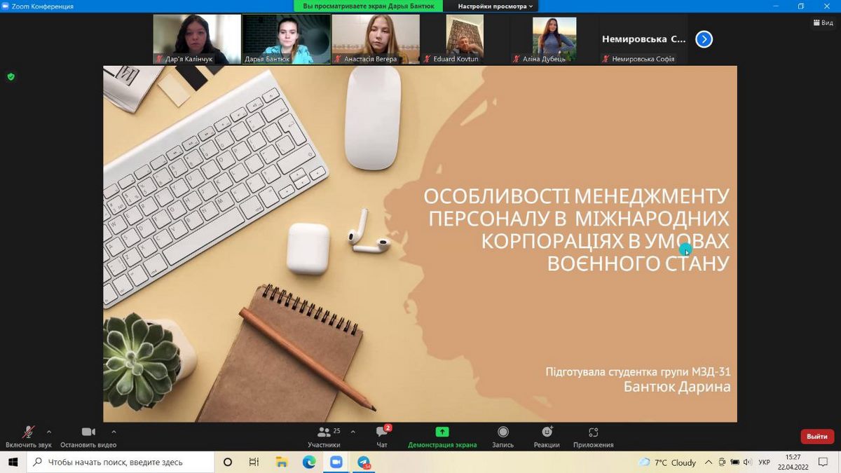 22 квітня 2022 року було проведено відкрите засідання дискусійного клубу "Менеджмент та публічне управління: інновації та глобальні тренди в умовах євроінтеграції" на тему "Управління персоналом у міжнародних корпораціях в сучасних умовах (воєнний стан)". Керівник – Едуард Ковтун. На засіданні були присутні здобувачі вищої освіти груп МЗД-31д, ПУА-31,32д та науково-педагогічні працівники кафедри менеджменту та адміністрування. З презентаціями на актуальні теми виступили наступні здобувачі вищої освіти: "Система управління персоналом у міжнародних корпораціях та їх структурних підрозділах в умовах воєнного стану" - Чернова Вікторія. "Кадрова політика міжнародних корпорацій та роль кадрових служб в управлінні людськими ресурсами в умовах воєнного стану" - Вегера Анастасія. "Особливості менеджменту персоналу в міжнародних корпораціях в умовах воєнного стану" - Бантюк Дарина. Члени дискусійного клубу прийняли жваву участь у дискусії, де кожний учасник засідання отримав відповіді на питання, які його зацікавили.