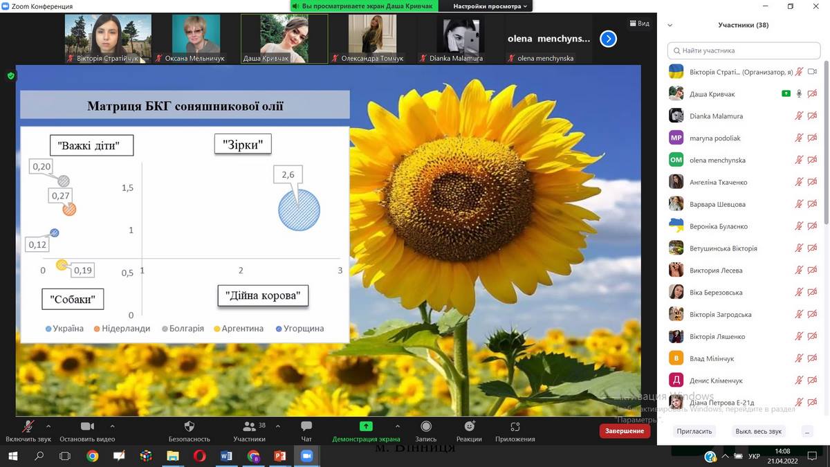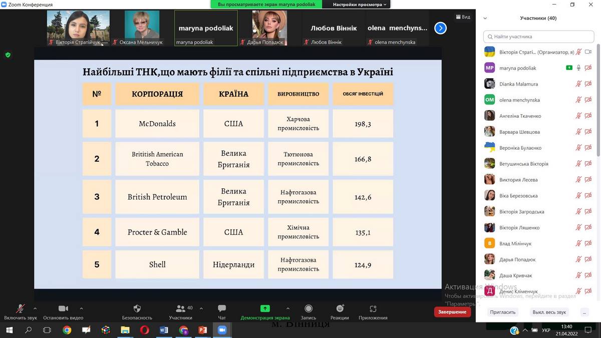 Студенти презентували цікаві та актуальні наукові дослідження, зокрема Подоляк Марина розповіла про ТНК як головного суб’єкта виробничої та інвестиційної діяльності; Ветушинська Вікторія презентувала дослідження щодо шляхів та засобів стимулювання підприємницької діяльності в умовах військового стану; Попадюк Дар’я, Томчук Олександра розглянули досвід впровадження у Європі «Плану Маршалла»; Кривчак Дарина здійснила оцінку міжнародної конкурентоспроможності олійно-жирової галузі України. Доповіді здобувачів доповнювалися жвавими дискусіями та обговоренням досліджуваних питань.