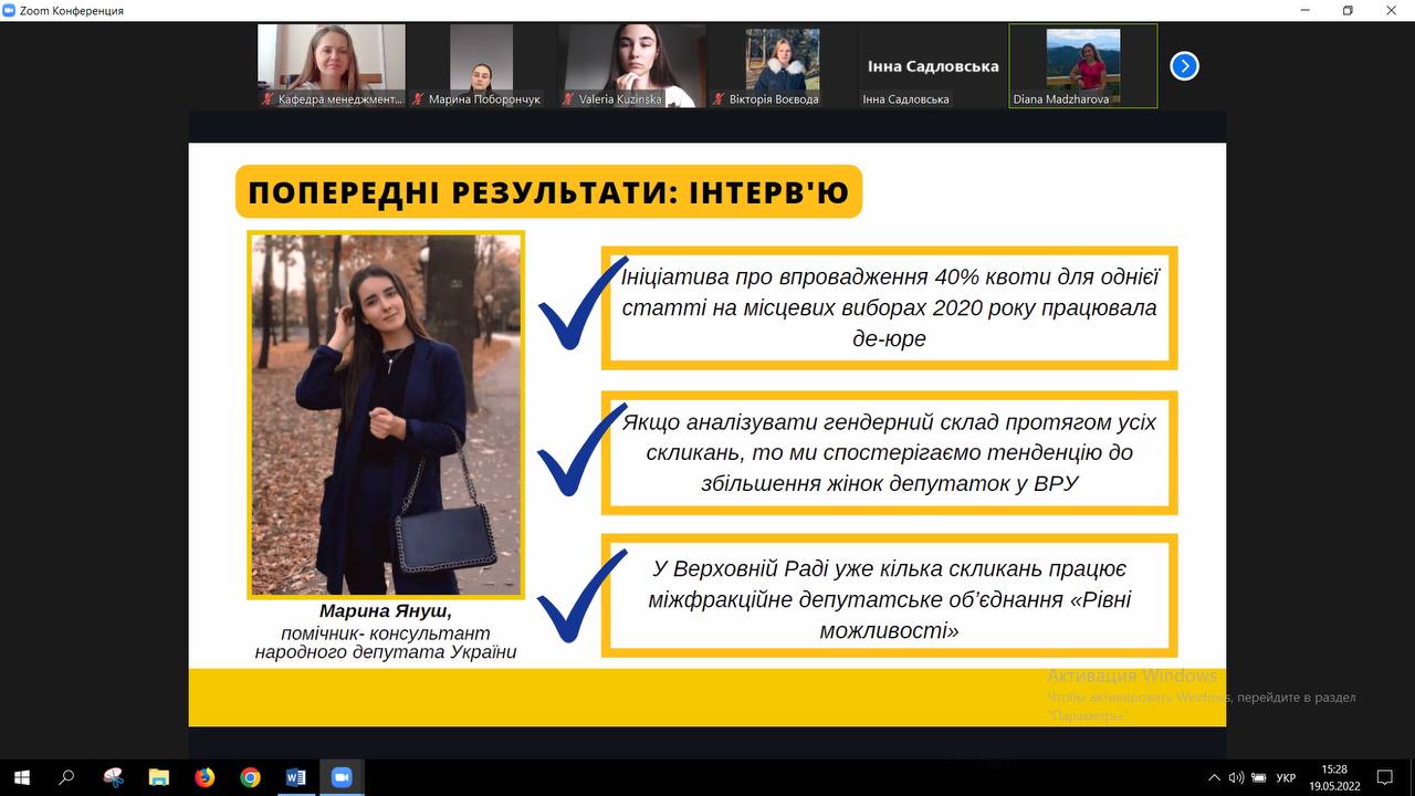 Студенти, які обрали у 2 семестрі 2021-2022 н.р. дану вибіркову дисципліну, презентували результати своєї роботи усім бажаючим, серед яких були експерти команди IFES, зокрема старша асистентка Анастасія Хорват, та запрошений експерт - випускниця ВТЕІ КНТЕУ Марина Януш, помічник-консультант народного депутата України.