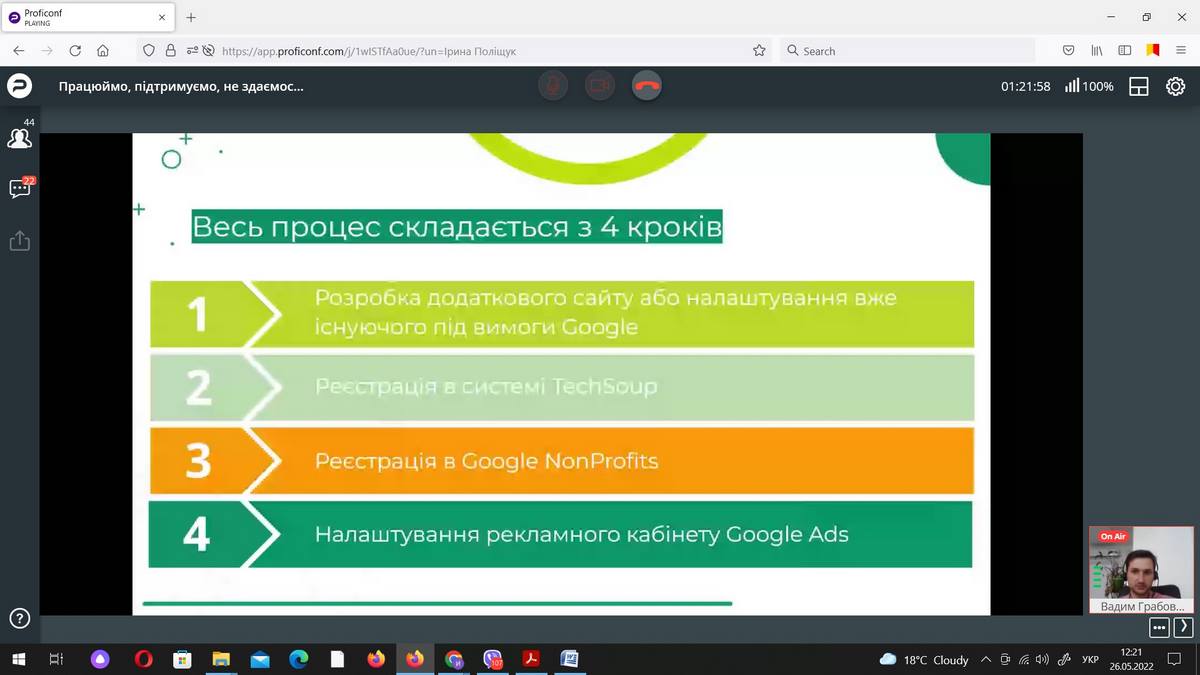 Під час онлайн-івенту були детально розглянуті питання: - Реклама — зброя українського бізнесу. Чому зараз і що змінилось? - Соціальні мережі, складнощі просування під час війни – що потрібно знати. - Соціально корисна діяльність та бізнес із програмою Google Ad Grants. - Адаптація бізнесу, співпраця з партнерами, донори та програми підтримки для МСБ. - Як допомагає бізнес бізнесу в реаліях війни. Кооперенція. Закарпатський бізнес-тил.