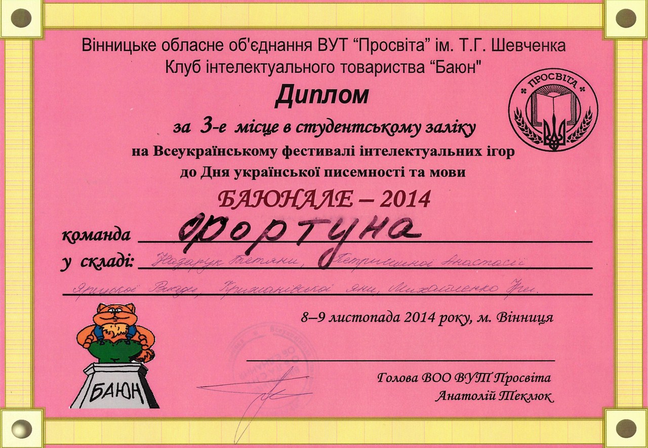 8-9 листопада 2014 року на базі ВНТУ відбувся фестиваль інтелектуально-спортивних ігор «Баюнале» за підтримки Вінницької обласної Федерації інтелектуально-спортивних ігор, в якому взяли участь понад 40 команд з різних міст України. Наш інститут представляла команда «Фортуна» у складі якої були студенти: Назарук Тетяна (МЕ-31) – капітан команди, Петришина Анастасія (МЕ-31), Михайленко Ірина (ДФК-41), Ярецька Влада (Т-11), Крижанівська Яна (ГРС-11). За студентським рейтингом фестивалю наші мужні дівчата вибороли почесне 3 місце серед 14 студентських команд з різних регіонів України. Команда «Фортуна» нагороджена Дипломом та кубком переможців «Граніт науки ІІІ ступеня»