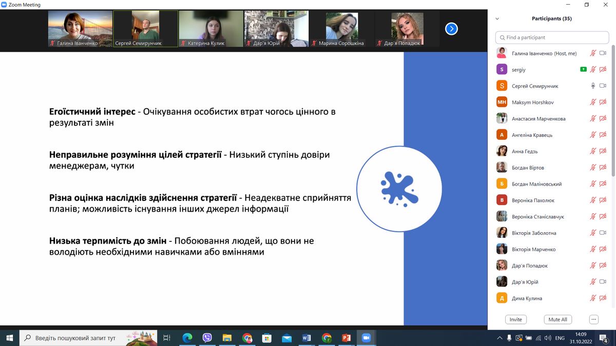 31 жовтня 2022 року викладачами кафедри менеджменту та адміністрування було організовано та проведено мітап «Актуальні проблеми менеджменту в умовах інноваційного розвитку» для здобувачів вищої освіти ступеня «бакалавр» спеціальностей «Менеджмент» і «Публічне управління та адміністрування» та «молодший бакалавр» спеціальності «Менеджмент». Метою заходу було обговорення сучасних тенденцій в сфері управління та пошуку шляхів розвитку України у післявоєнний період.