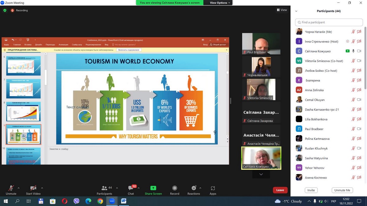 18 листопада 2022 року науково-педагогічні працівники кафедри туризму та готельно-ресторанної справи, здобувачі вищої освіти за спеціальностями 241 «Готельно-ресторанна справа», 242 «Туризм» взяли участь у ІІ Міжнародній конференції «Розвиток туристичної галузі та індустрії гостинності: проблеми, перспективи, конкурентоздатність», організованій Університетом імені Альфреда Нобеля (м. Дніпро).