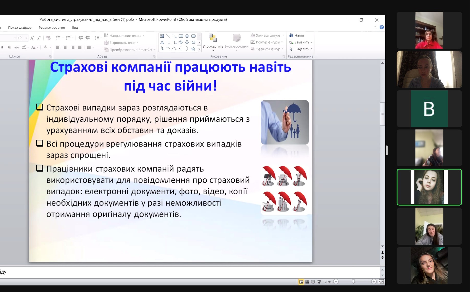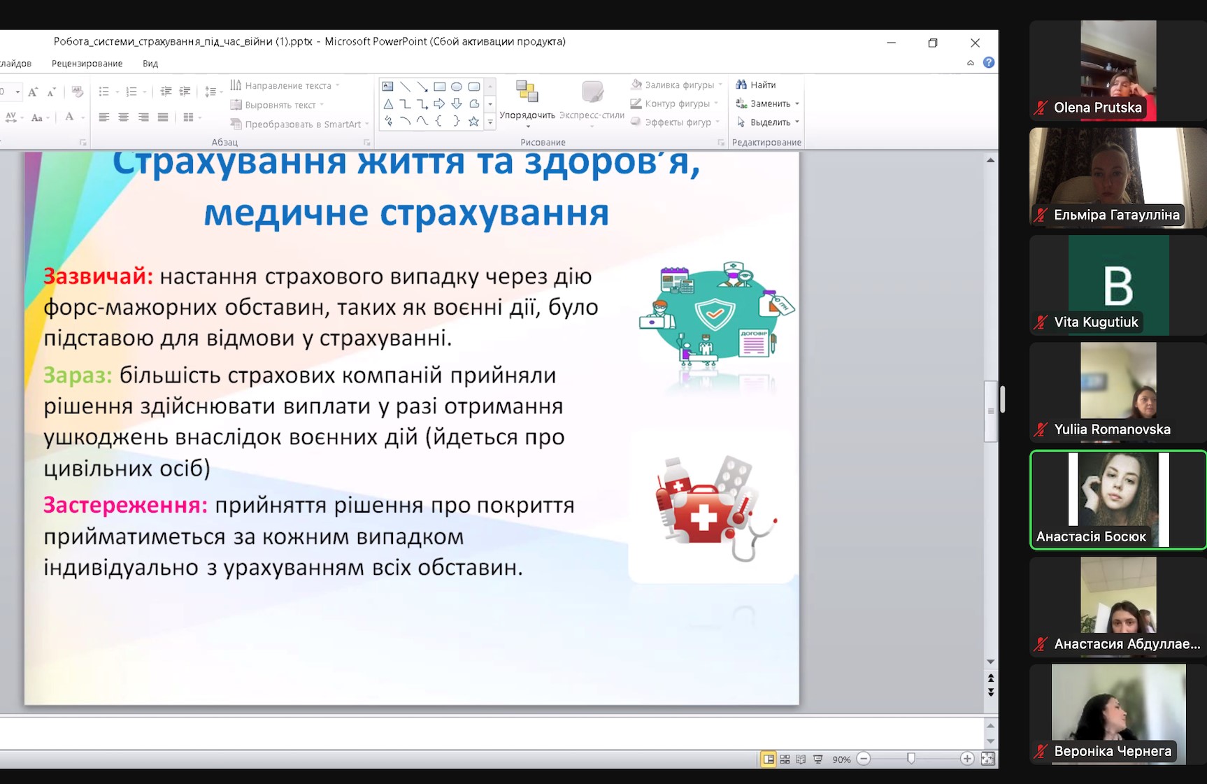1 грудня 2022 року відбулося засідання студентського наукового гуртка «Сучасна фінансова політика України: проблеми та перспективи», доповідачі цікаво розкрили актуальну в наш час тему а саме: «Проблеми організації та управління у сфері страхового бізнесу під час воєнного стану в Україні» Після кожної доповіді велася активна дискусія у якій брали участь студенти груп ФБСС-41д, ФБСС-42д, ФБСС-31д, ФБСС-21д, ФБСС-21мб, ФБСС-11мб.