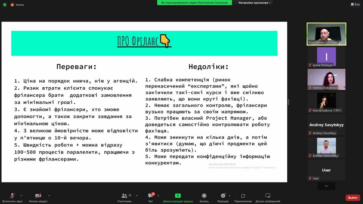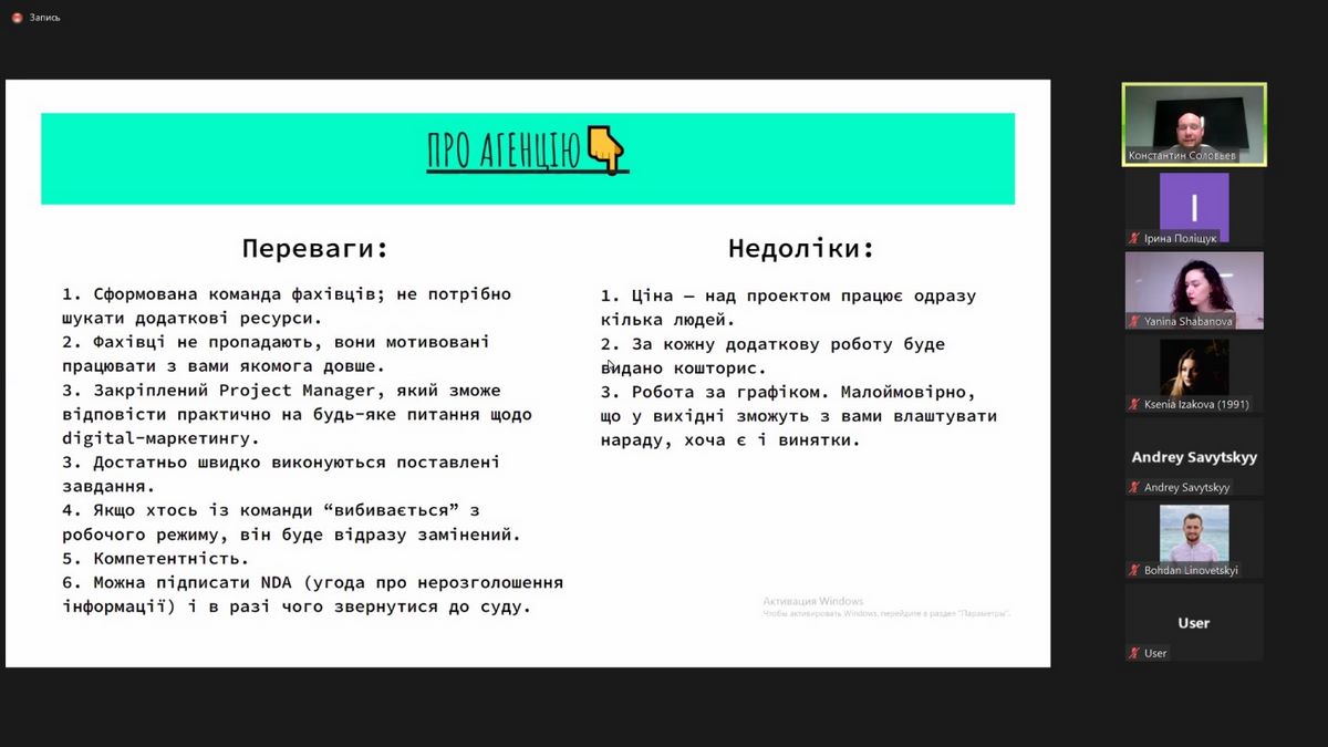 Слухачі отримали цікаві знання про принцип Fail Fast, чому невдачі в стартапах бувають, що краще обирати для виходу стартапу на ринок – маркетинг-агенцію або фріланс, які види агенцій існують та скільки коштують їхні послуги, як працювати з підрядниками, щоб отримати результат.