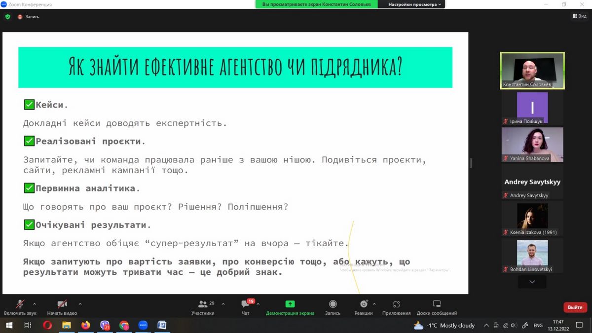 13 грудня 2022 року здобувачі вищої освіти спеціальності 075 «Маркетинг» разом із науково-педагогічними працівниками кафедри маркетингу та реклами взяли участь в онлайн-лекції «Вихід стартапу на ринок» в рамках програми Mentor Yard, що проводив Констянтин Соловйов – консультант з growth-маркетингу, засновник Soloviov Marketing Agency.