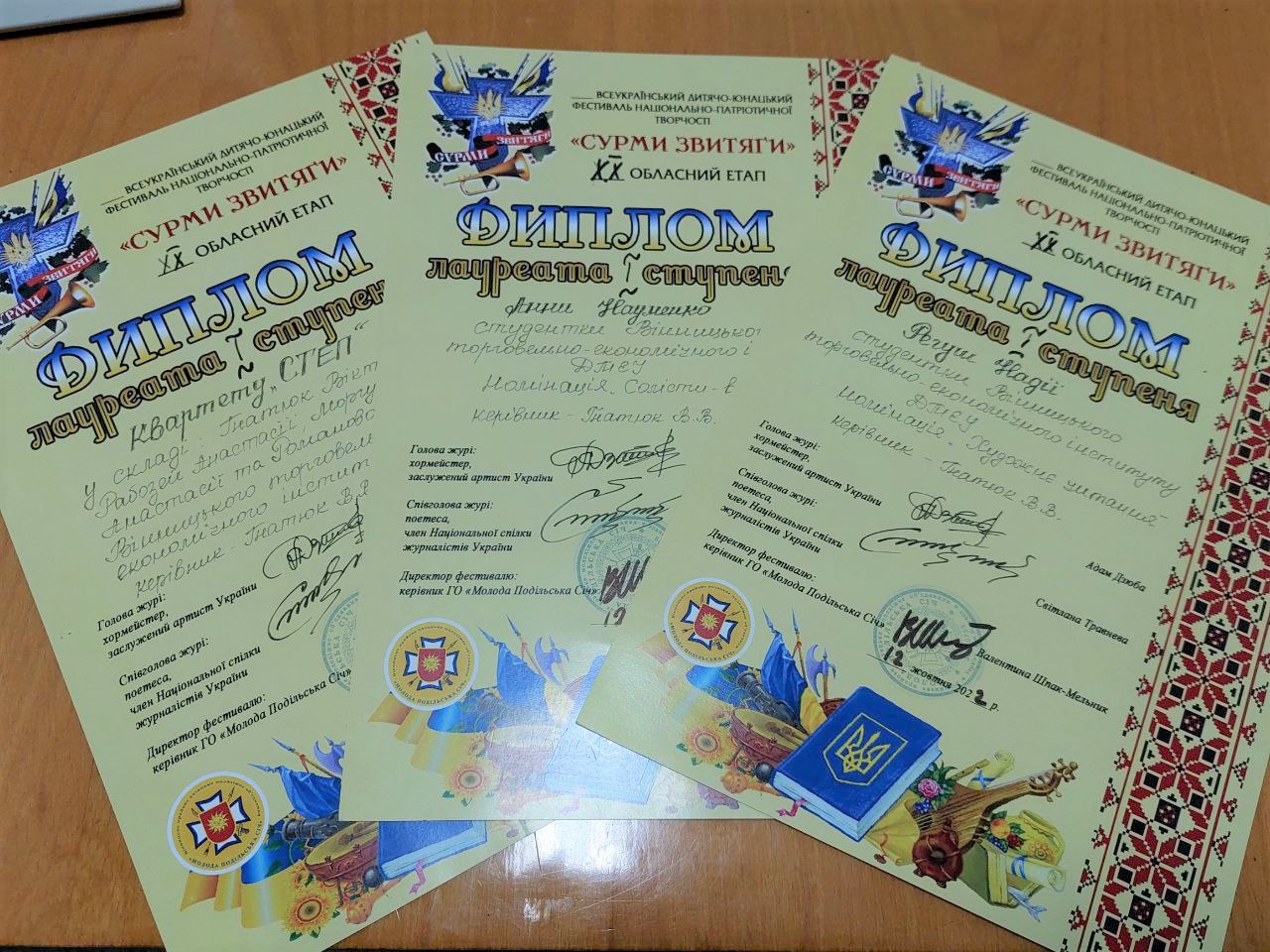 В ньому брали участь творчі колективи, солісти та читці культурно-мистецького відділу Вінницького торговельно-економічного інституту, які вибороли призові місця в конкурсний день фестивалю: солістка Анна Науменко; читець Надія Регуш; вокальний квартет «СТЕП» у складі Анастасії Рабозей, Анастасії Моргунової, Анастасії Романової та Вікторії Гнатюк - художнього керівника конкурсантів від ВТЕІ.