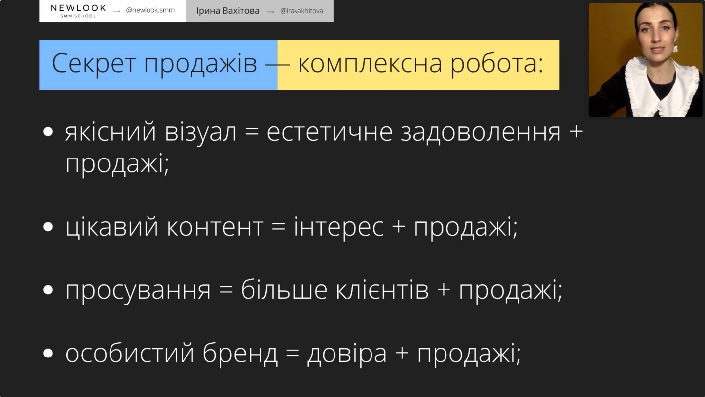 Спікерка майстер-класу – Ірина Вахітова, блогерка, яка створює контент для відомих брендів, співвласниця школи для SMMщиків розповіла про розвиток особистого бренду як потужного інструменту продажів та залучення клієнтів; тренди візуалу 2023 року; особливості створення публікацій, які виведуть акаунт в топ рекомендації та секрети ефективних технік просування (Reels, хештеги, колаборації).