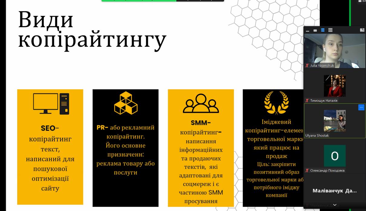 22 лютого 2023 року для школярів 9-В класу КЗ «Вінницький ліцей №10» старший викладач кафедри іноземної філології та перекладу Уляна Шостак і асистент кафедри іноземної філології та перекладу Юлія Ясенчук в оналайн-форматі провели практичне заняття «Комунікації в соціальних мережах». Мета заходу узагальнення знань учнів про вимоги до мовлення та мовних норм у соціальних мережах.