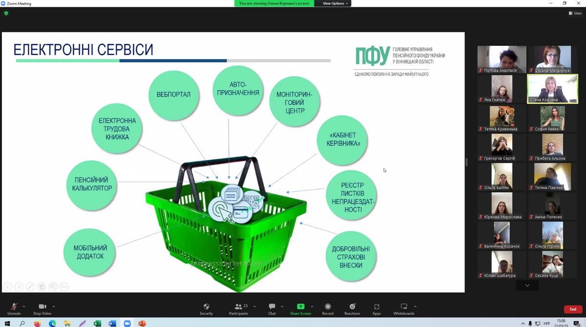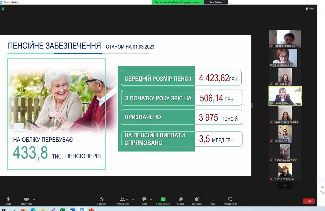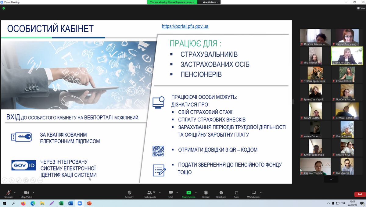 Виступ Олени Корчаки було присвячено проблемам та сучасним викликам, які стоять перед Пенсійним фондом України в умовах воєнного стану. Презентація супроводжувалась численними прикладами професійної діяльності щодо послуг, які надаються установою: про пенсійні виплати, платників єдиного соціального внеску та застрахованих осіб, електронні листки непрацездатності, організацію роботи з питань соціального забезпечення. Окремо зазначено про впровадження і розвиток інформаційних технологій при обслуговуванні громадян.
