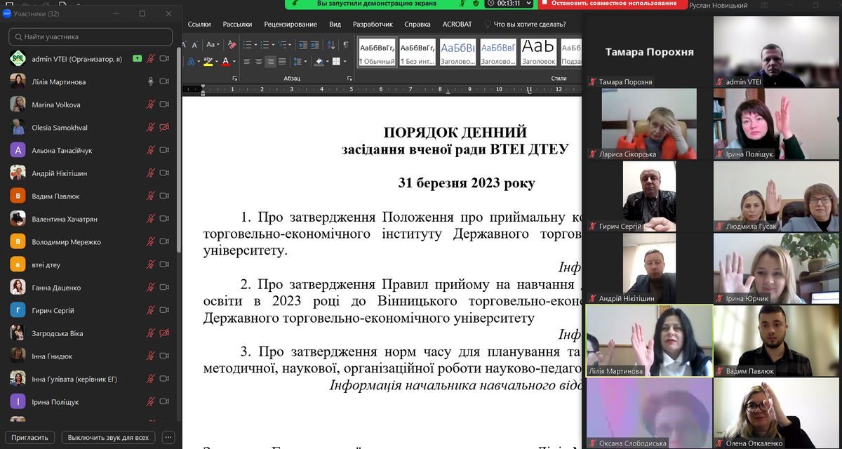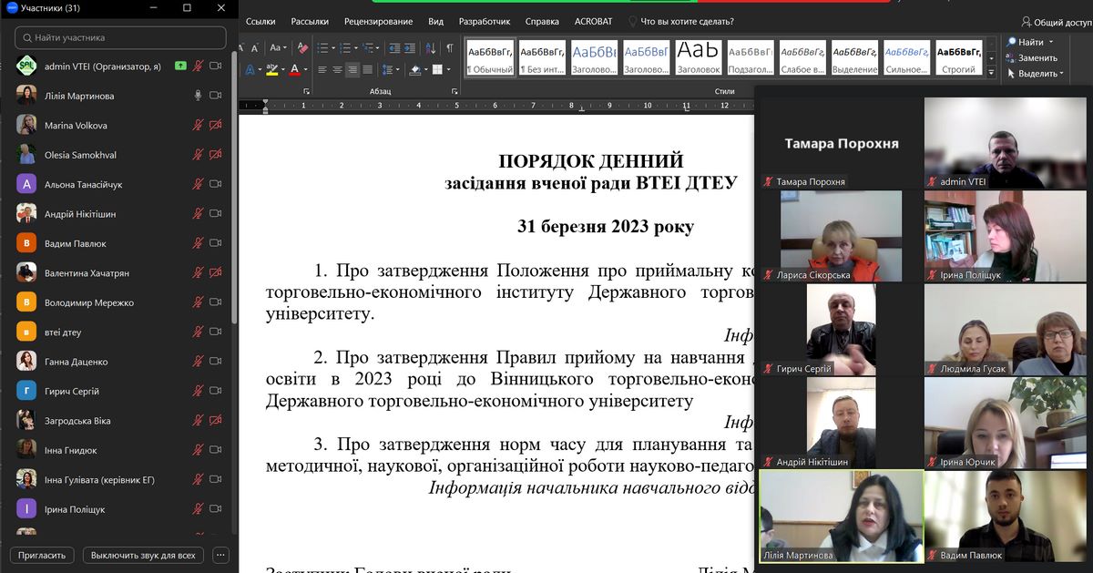 31 березня 2023 року відбулося засідання вченої ради ВТЕІ ДТЕУ, на якому були затверджені документи та ухвалені відповідні рішення згідно порядку денного.