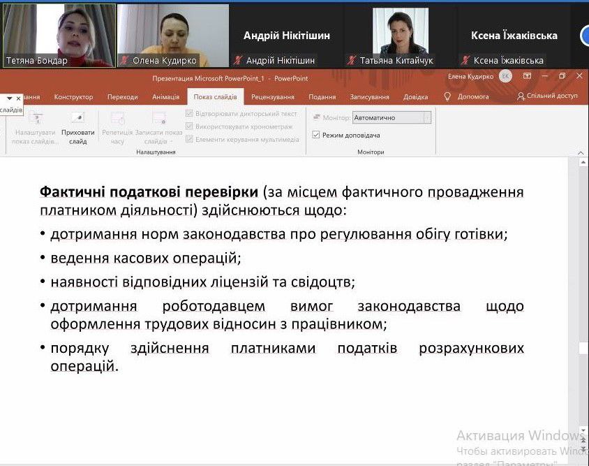 Бондар Тетяна акцентувала увагу на особливостях проведення податкових перевірок в умовах воєнного стану, на змінах до законодавчих актів щодо проведення податкових перевірок в умовах воєнного стану, а також на видах податкових перевірок, що дозволені під час воєнного стану в Україні.