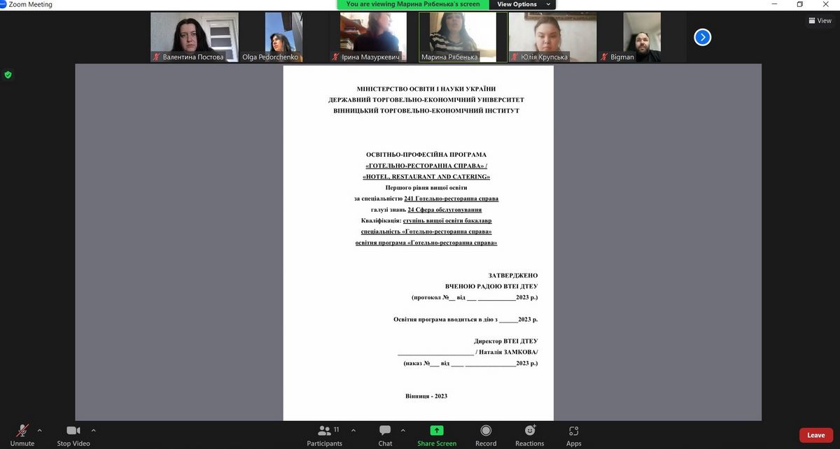 21 квітня 2023 року відбулося засідання робочої групи з розроблення освітньо-професійних програм «Готельно-ресторанна справа» ОС «бакалавр» та «магістр». У засіданні брали участь науково-педагогічні працівники кафедри туризму та готельно-ресторанної справи, директори закладів готельного та ресторанного господарства, випускники освітніх програм та здобувачі вищої освіти, які здобувають освіту за освітнім ступенем «бакалавр», «магістр».