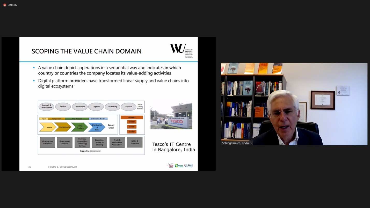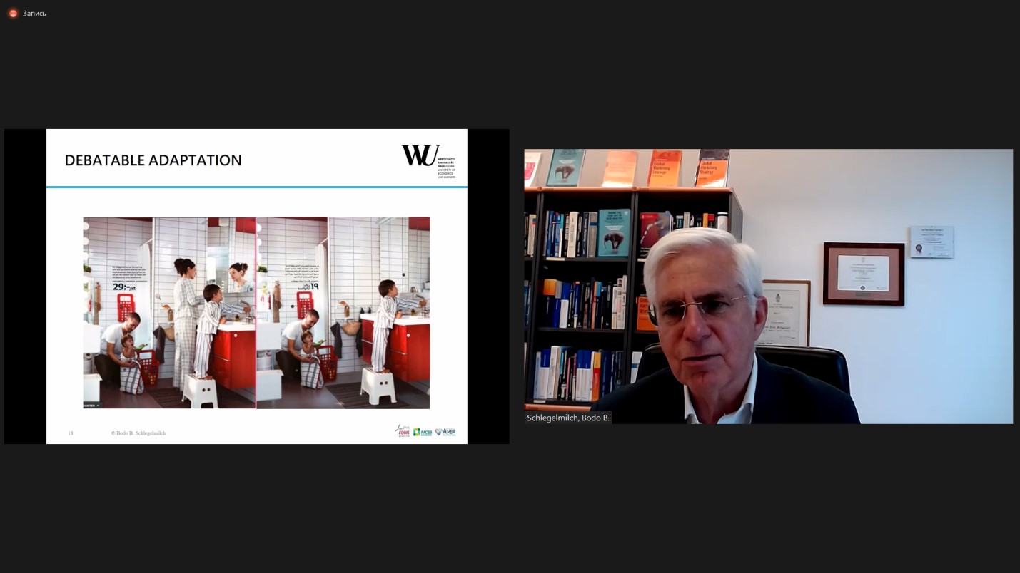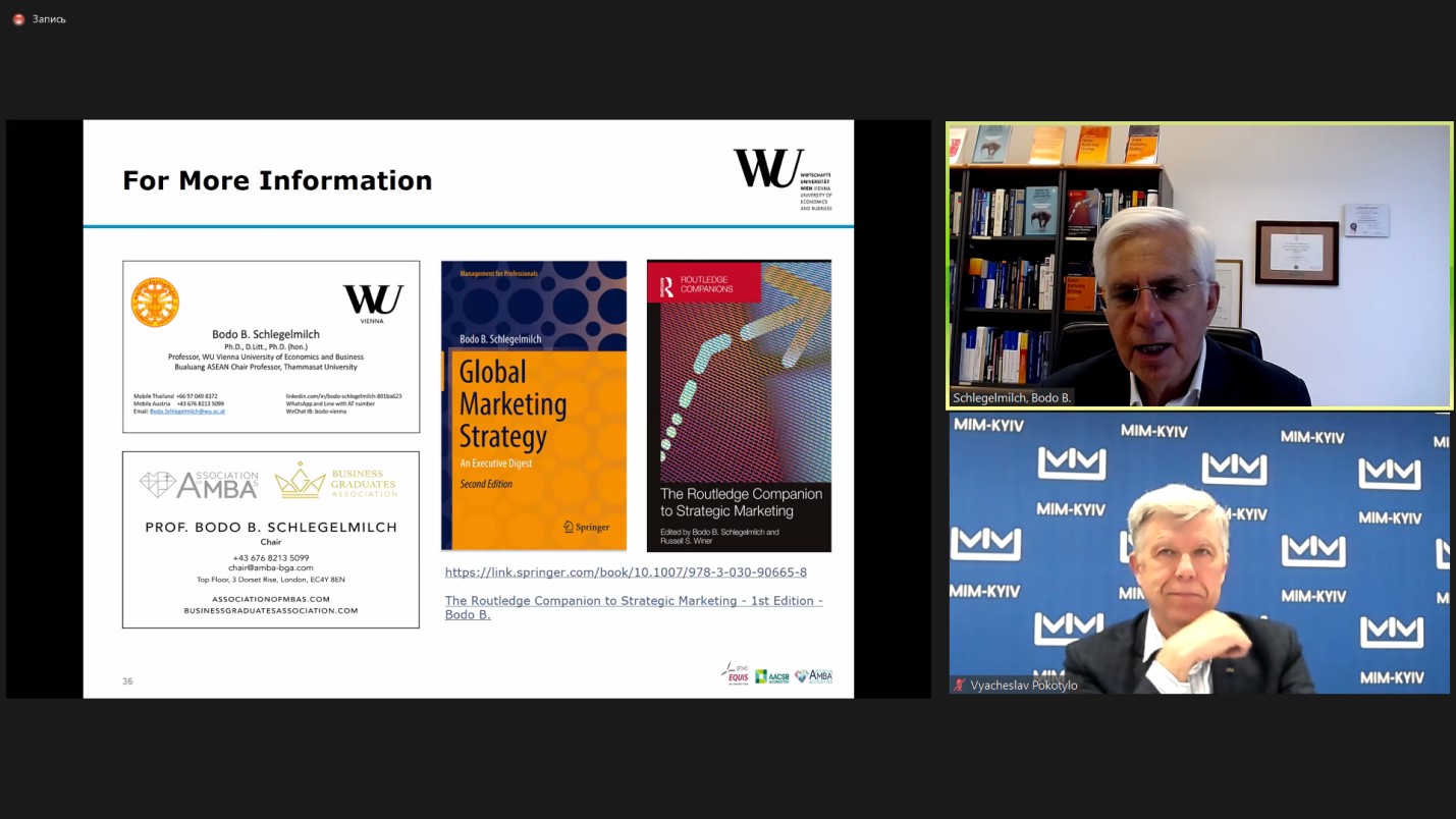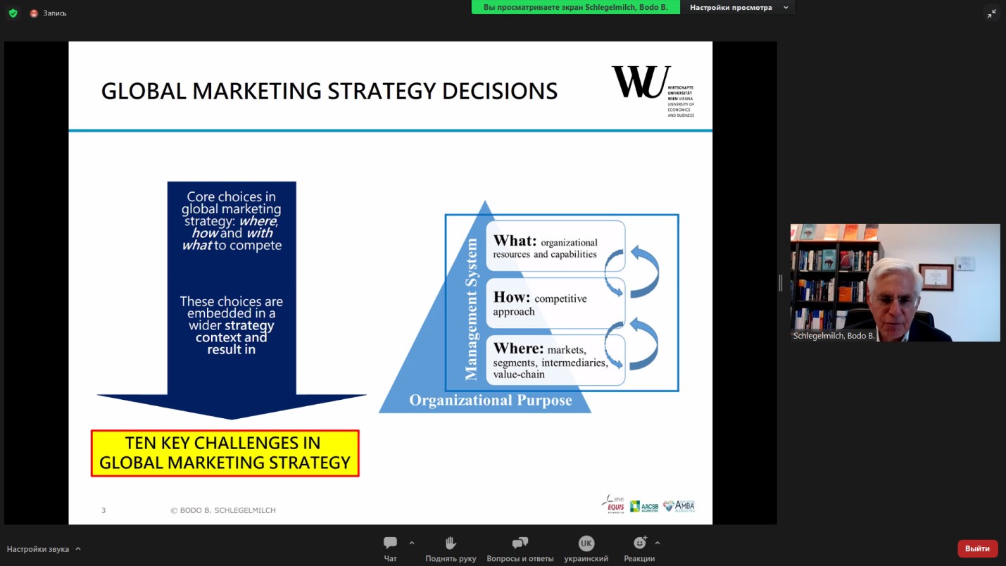 Онлайн-лекція була проведена професором Бодо Шлегельмільхом, який очолює Інститут управління міжнародним маркетингом Віденського Університету (WU Vienna) та є головою ради директорів міжнародних асоціацій бізнес-освіти AMBA та BGA.