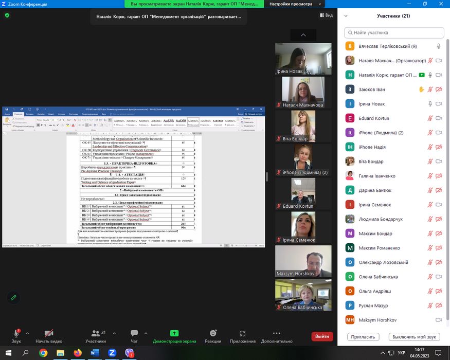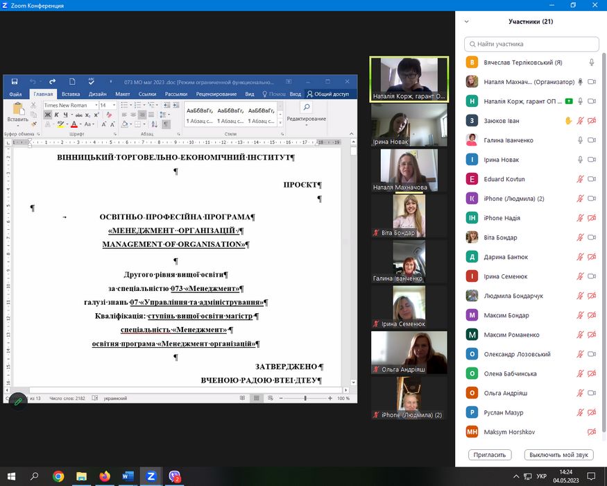 4 травня 2023 року відбулось підсумкове засідання робочих груп з розроблення освітніх програм (ОП) «Менеджмент» (молодший бакалавр), «Менеджмент організацій» (бакалавр, магістр), «Менеджмент зовнішньоекономічної діяльності» (бакалавр), за участі керівників сучасних підприємств Вінниччини, науково-педагогічних працівників кафедри менеджменту та адміністрування, студентів та випускників галузі знань 07 «Управління та адміністрування».