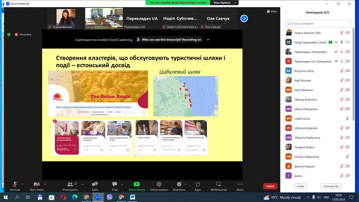 12 травня 2023 року науково-педагогічні працівники кафедри туризму та готельно-ресторанної справи, здобувачі вищої освіти за спеціальністю 242 «Туризм» взяли участь у круглому столі на тему «Розвиток кластерів сільського зеленого туризму в нових реаліях», організованому Київським національним університетом імені Тараса Шевченка за результатами реалізації проєкту «Покращення малого бізнесу та розвиток системи університетської освіти через дослідження та прочування туристичних кластерів у сільській місцевості в Україні», що фінансується Естонським центром міжнародного розвитку.