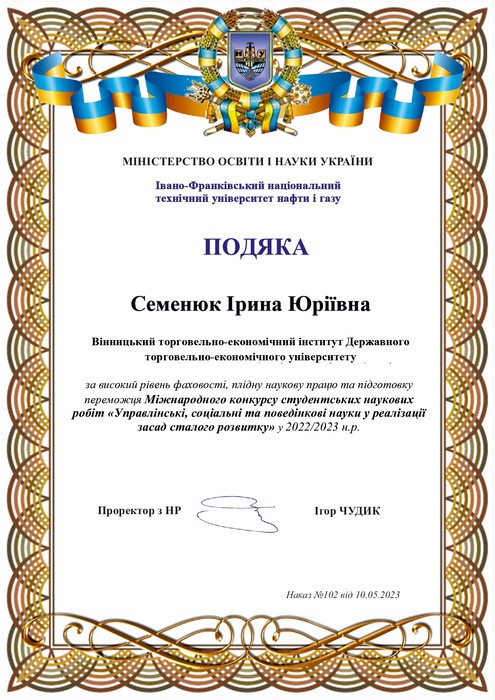 диплом ІІІ ступеня: Діана Маджарова – студентка 4 курсу бакалаврату з науковою роботою на тему «Молодіжне волонтерство як соціальний феномен: досвід України та Великої Британії», виконаною під науковим керівництвом канд. екон. наук, доцентки кафедри менеджменту та адміністрування Ірини Семенюк.