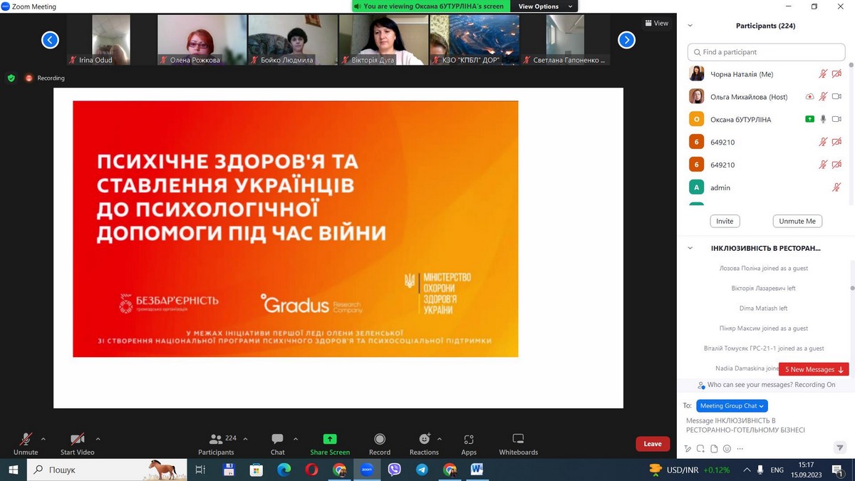 15 вересня 2023 року науково-педагогічні працівники кафедри туризму та готельно-ресторанної справи, здобувачі вищої освіти за спеціальністю 241 «Готельно-ресторанна справа» пройшли онлайн навчання на тему «Інклюзивність у готельно-ресторанному бізнесі». Спікерами заходу виступили Ольга Михайлова, керівник тренінгового центру «PROFI CLUB» і співзасновник ГО «Ресторанна Гільдія», Олена Булах, голова ГО «Ассоціація рестораторів та готельєрів», Оксана Бутурліна, директор центру компетенцій Федерації організацій роботодавців.