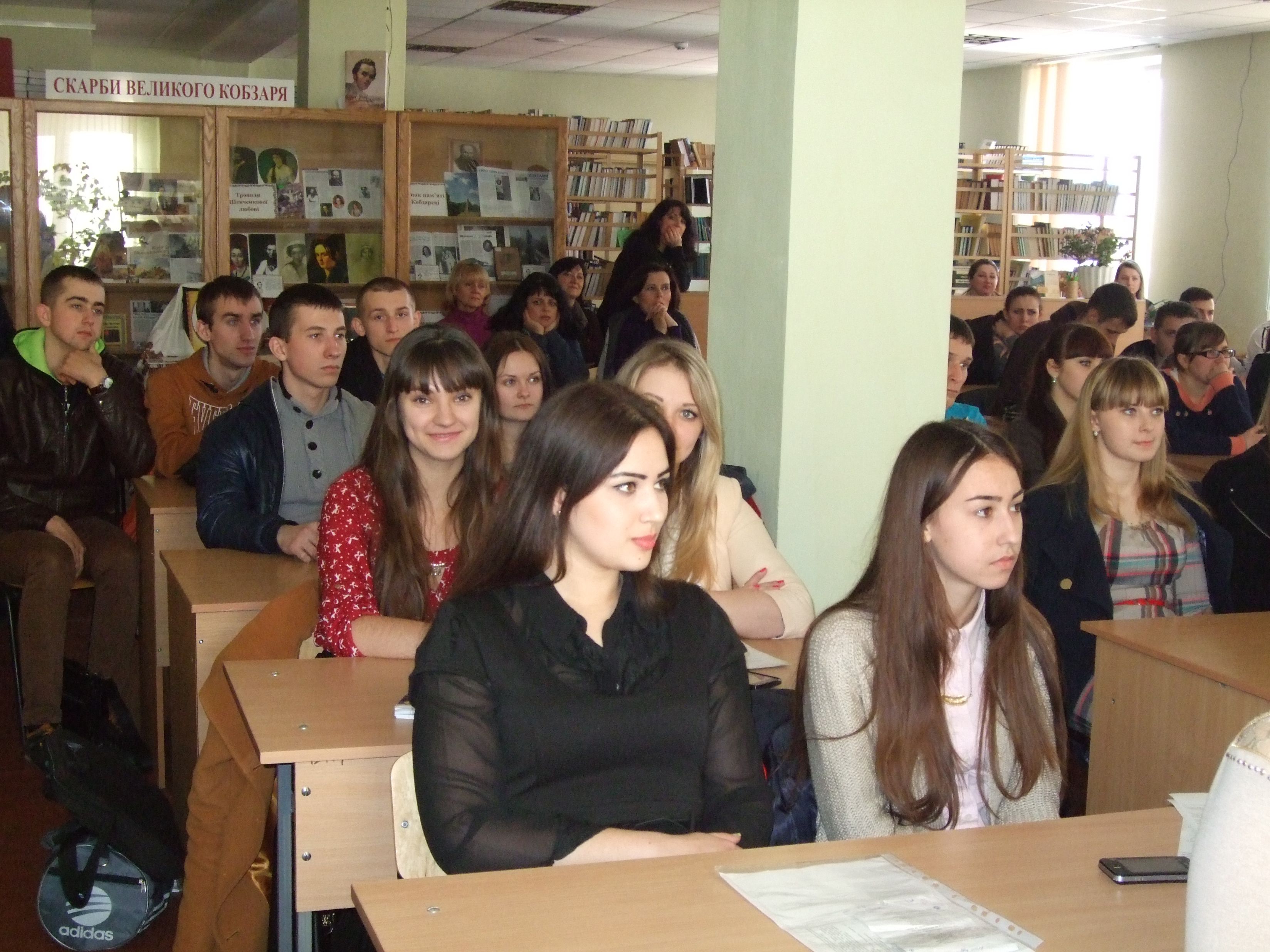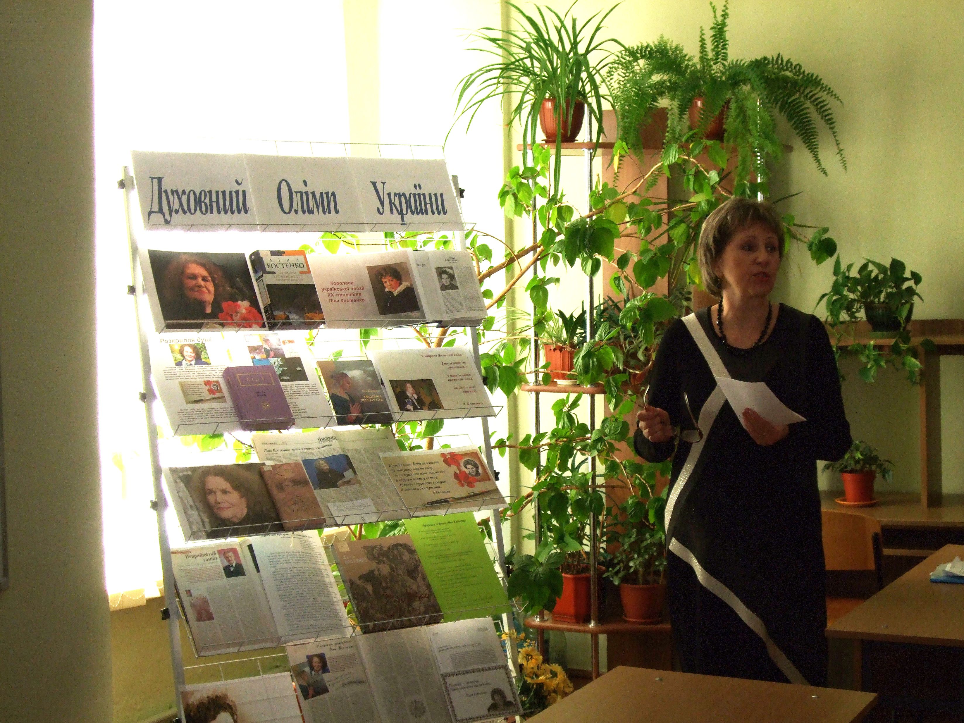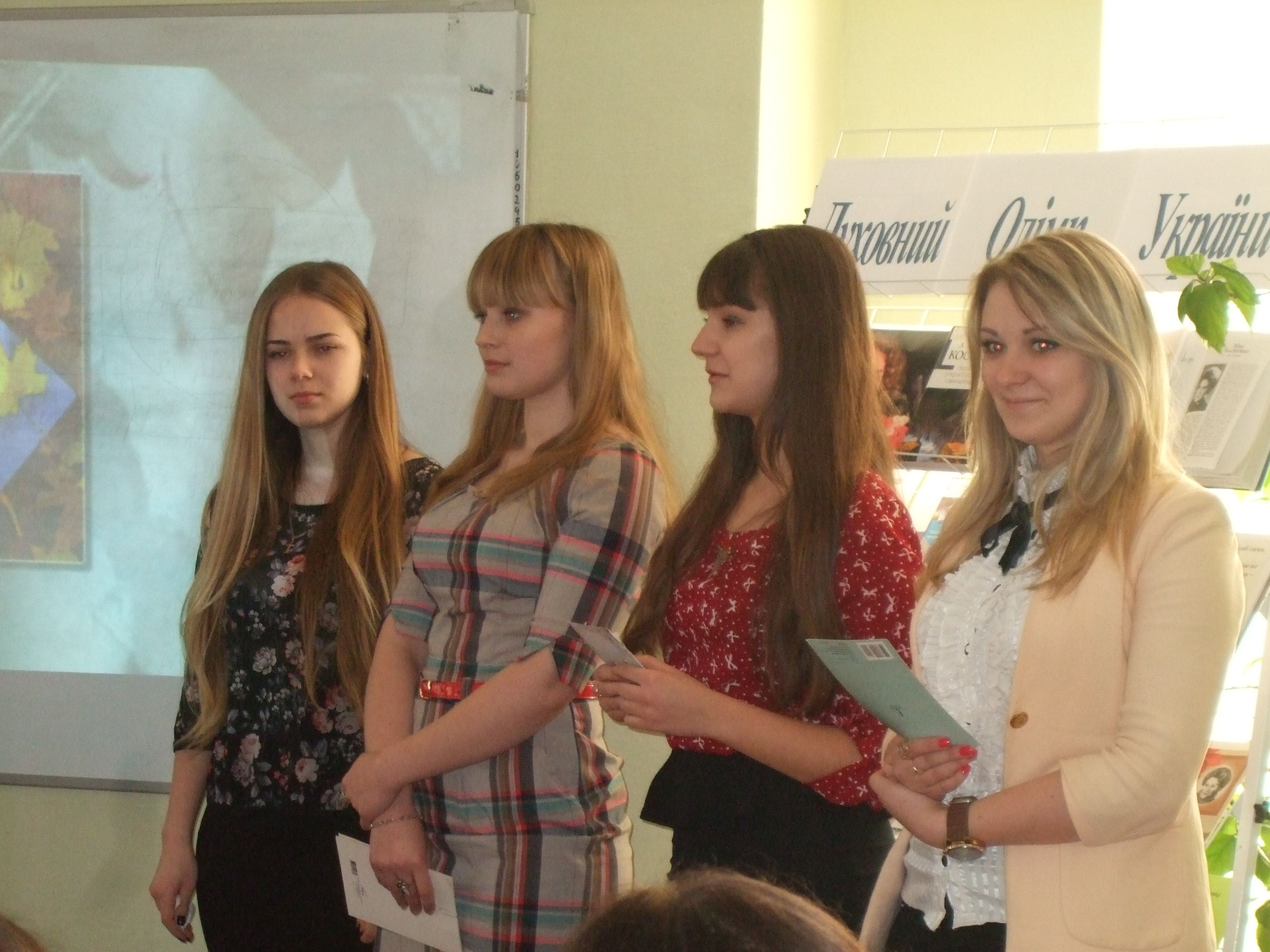 Майстерно передали силу і велич художнього слова Ліни Костенко студенти гр.ДФ-22 : (куратор групи Далевська Т.А., кафедра фінансів). Захід супроводжувався слайд-презентацією про життя та творчість поетеси та використанням буктрейлерів на книги Ліни Костенко. Цікавим доповненням була демонстрація відеокліпів з творчого вечора майстра слова у Харкові в рамках презентації роману «Записки українського самашедшого» та вірша Л. Костенко «Крила» у виконані Б.Ступки. Зачарував слухачів відеозапис майстерно виконаних романсів унікальним голосом Ольги Богомолець із книги поезій «Гіацинтове сонце». Завідувач відділу обслуговування Людмила Ровінська презентувала книжково-ілюстративну виставку «Духовний Олімп України». Присутні мали змогу ознайомитися з виданнями творів Ліни Костенко та статтями із періодичних видань з фондів бібліотеки. Захід пройшов в атмосфері неповторності лірики Ліни Костенко.