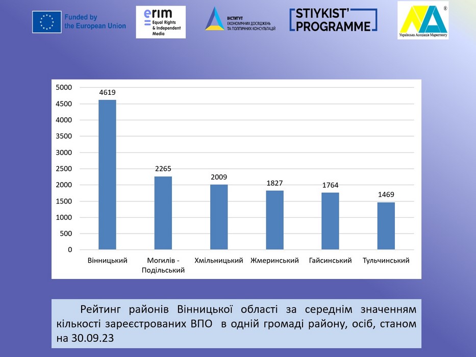22 листопада 2023 року відбувся круглий стіл «Дослідження соціально-економічного становища та потреб ВПО у Вінниці та Вінницькій області». Дослідження реалізовувалося Вінницьким відокремленим підрозділом ГО «Українська Асоціація Маркетингу» в партнерстві з ГО «Мережа громадських організацій підтримки ВПО в Україні», Вінницьким торговельно-економічним інститутом ДТЕУ.