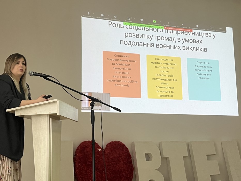 Соціальне підприємництво як інструмент розвитку громад в умовах подолання воєнних викликів. Доповідачка: Ірина Семенюк, кандидатка економічних наук, доцентка кафедри менеджменту та адміністрування ВТЕІ ДТЕУ, керівник Центру грантових проєктів, керівник ГО «Можливості. Сталий розвиток. Підприємництво Україна». Врахування цілей сталого розвитку міст та спільнот у повоєнній відбудові України. Доповідачка: Віта Бондар, асистент кафедри менеджменту та адміністрування ВТЕІ ДТЕУ, аспірантка кафедри публічного управління та адміністрування ДТЕУ, заступник голови правління ГО «Лабораторія суспільних змін».