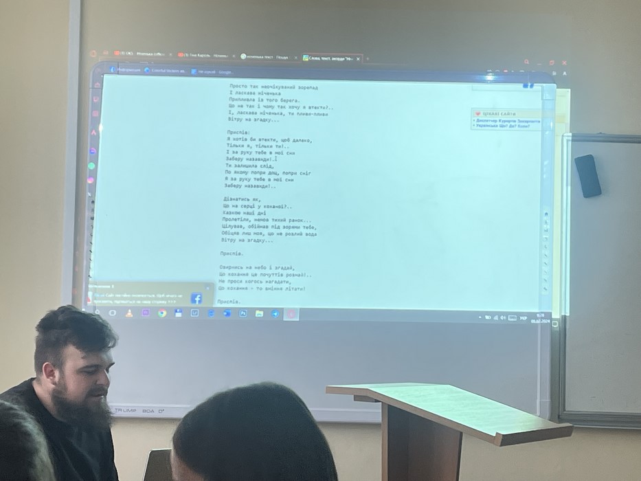 5 лютого 2024 року кафедрою іноземної філології та перекладу було проведено майстер-клас «Особливості перекладу пісенної лірики». Як зберегти в перекладі пісенної лірики унікальну риму, настрій, авторський задум? Студенти спеціальності «Філологія» шукали відповідь на це питання разом із запрошеними спікерами: Віктором Волосом, музичним маркетологом, вінницьким режисером музичних кліпів, та співаком Віталієм Оксом (OKS), фіналістом десятого сезону шоу «Голос країни».