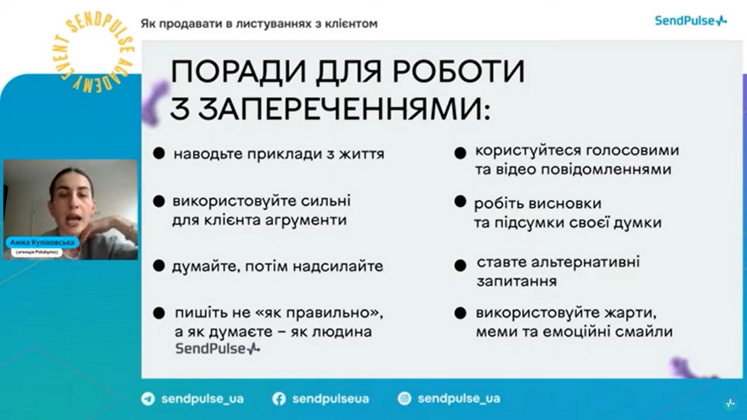 - Головні помилки у продажах: Аніка проаналізувала поширені помилки, яких припускаються продавці під час листування з клієнтами, та дала поради, як їх уникнути;