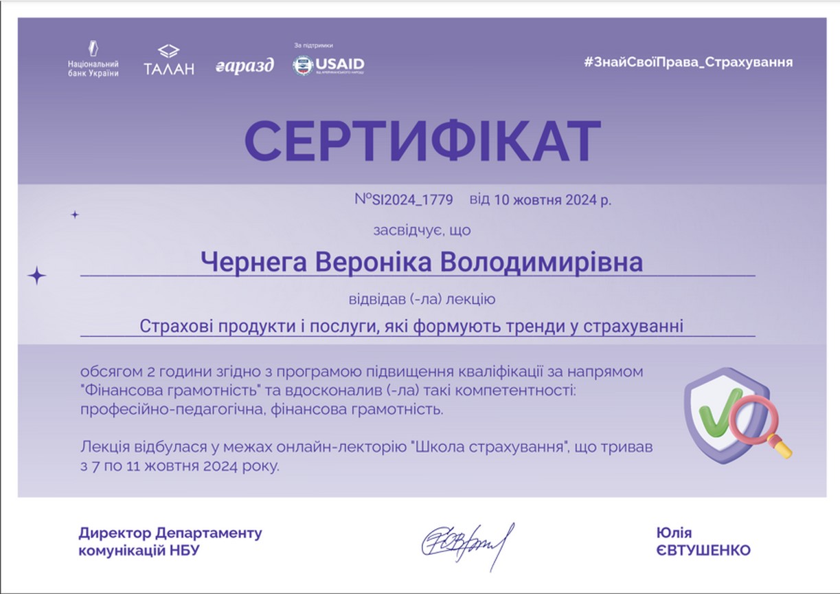 Викладачем кафедри фінансів Чернегою Веронікою взято участь у лекції "Страхові продукти і послуги, які формують тренди у страхуванні", що здійснювалась в рамках програми підвищення кваліфікації для освітян за напрямом “Фінансова грамотність” за ініціативи Національного банку України відбувся онлайн-лекторій «Школа страхування».