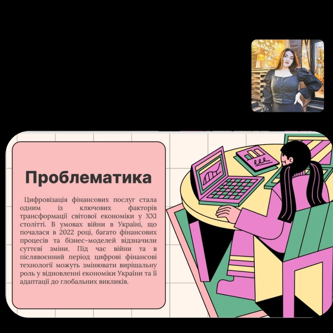Студентка 3 курсу обрала актуальну тему «Цифровізація фінансових послуг в Україні як драйвер економічного розвитку після війни» та разом із науковим керівником Юлією Романовською провела дослідження потенціалу цифровізації у сфері фінансів. На конференції обговорили та підсумували результати наукових досліджень студентів закладів вищої освіти, що стосуються сучасних тенденцій і перспектив розвитку фінансово-кредитних систем.