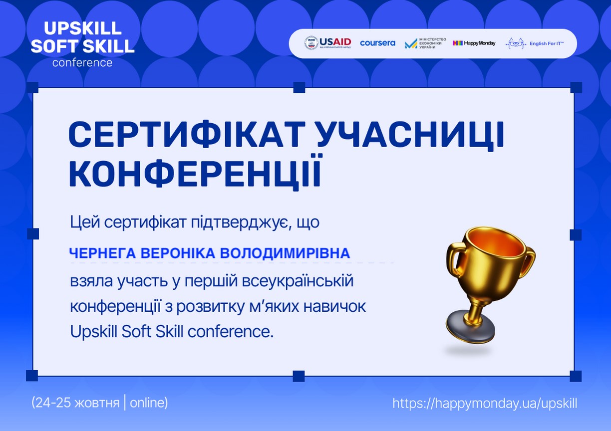 24-25 жовтня асистент кафедри фінансів Чернега Вероніка взяла участь у UpSkill Soft Skill conference.