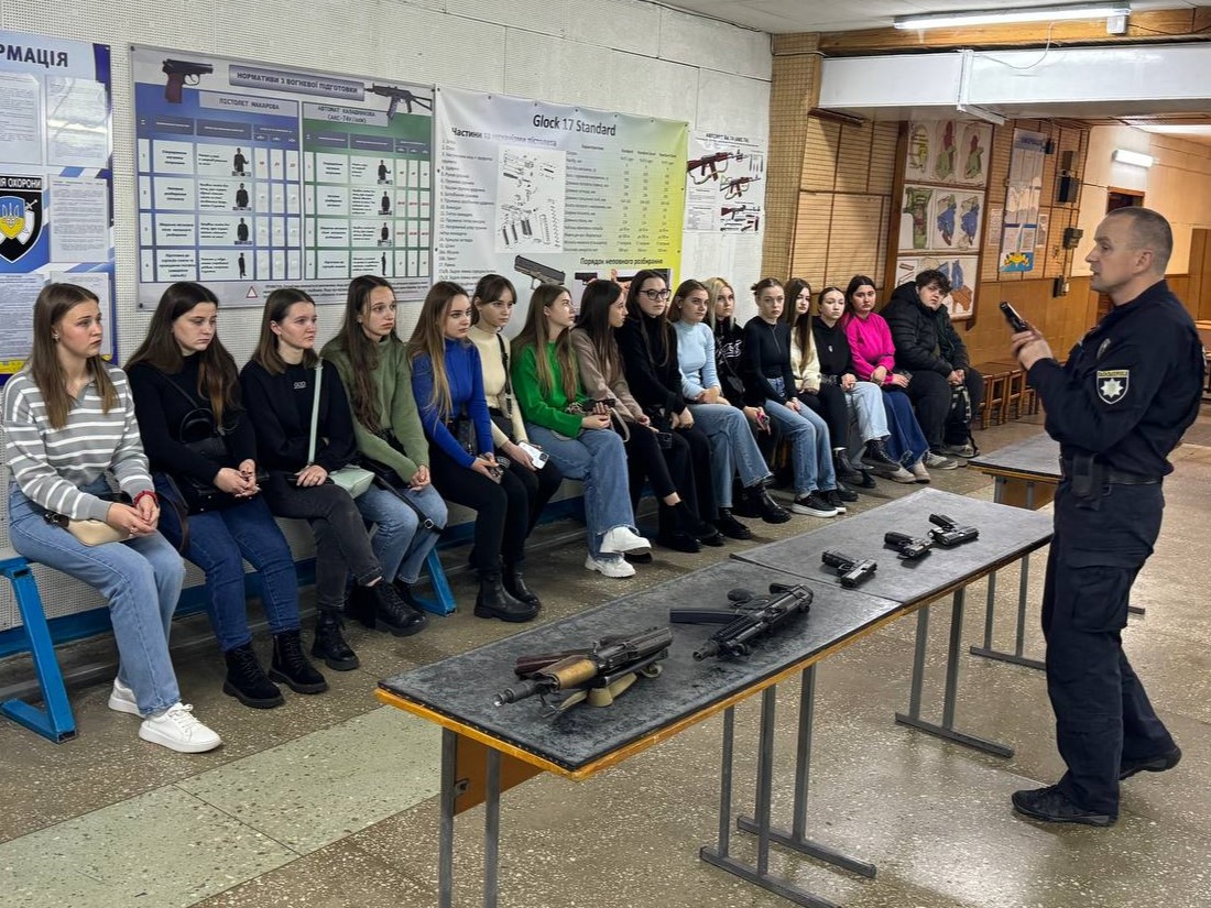 Майор поліції Михайло Шароварський провів заняття з вогневої підготовки, під час якого студенти отримали знання про правила безпечного поводження зі зброєю та основи техніки стрільби.