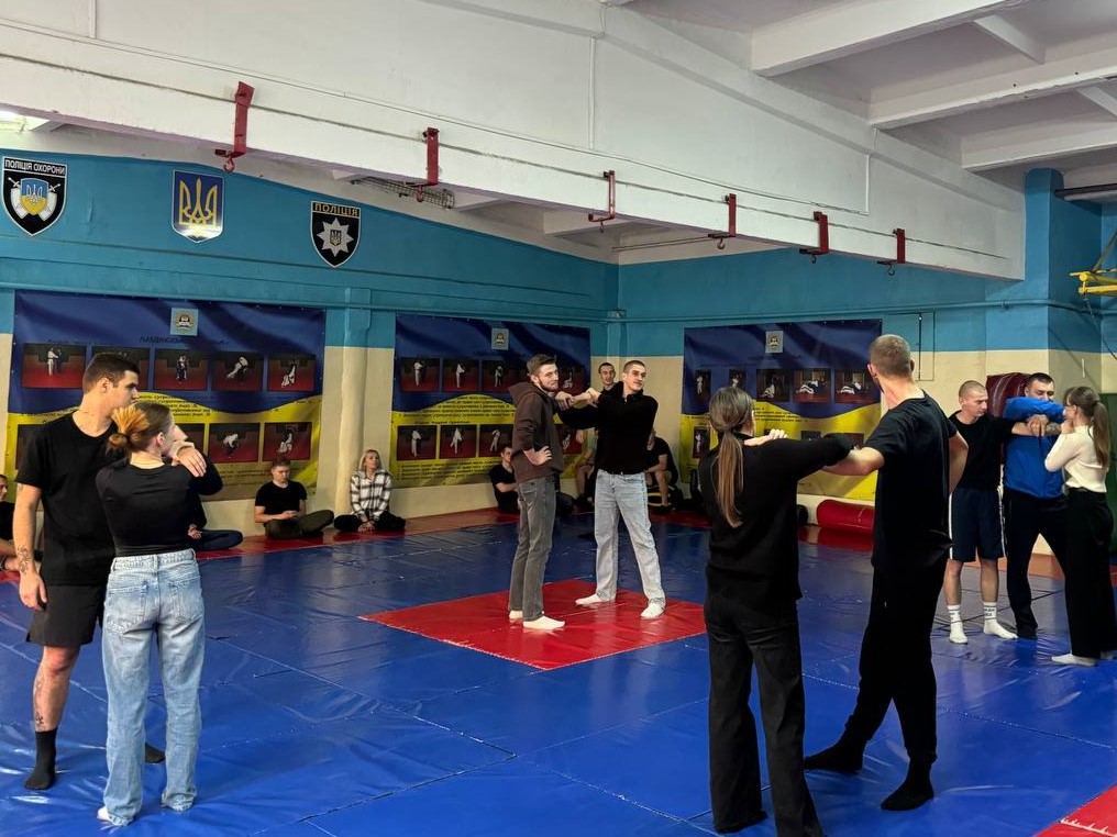 Тактичну підготовку з елементами самозахисту провів майор поліції Олександр Шалімов, продемонструвавши основні прийоми захисту, які можуть знадобитися у реальних загрозливих ситуаціях.