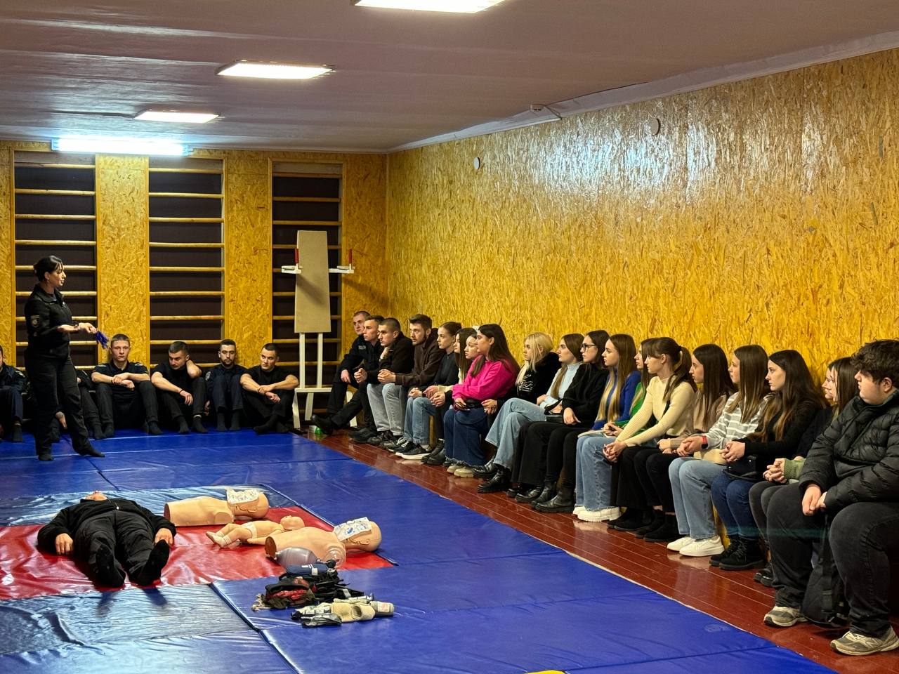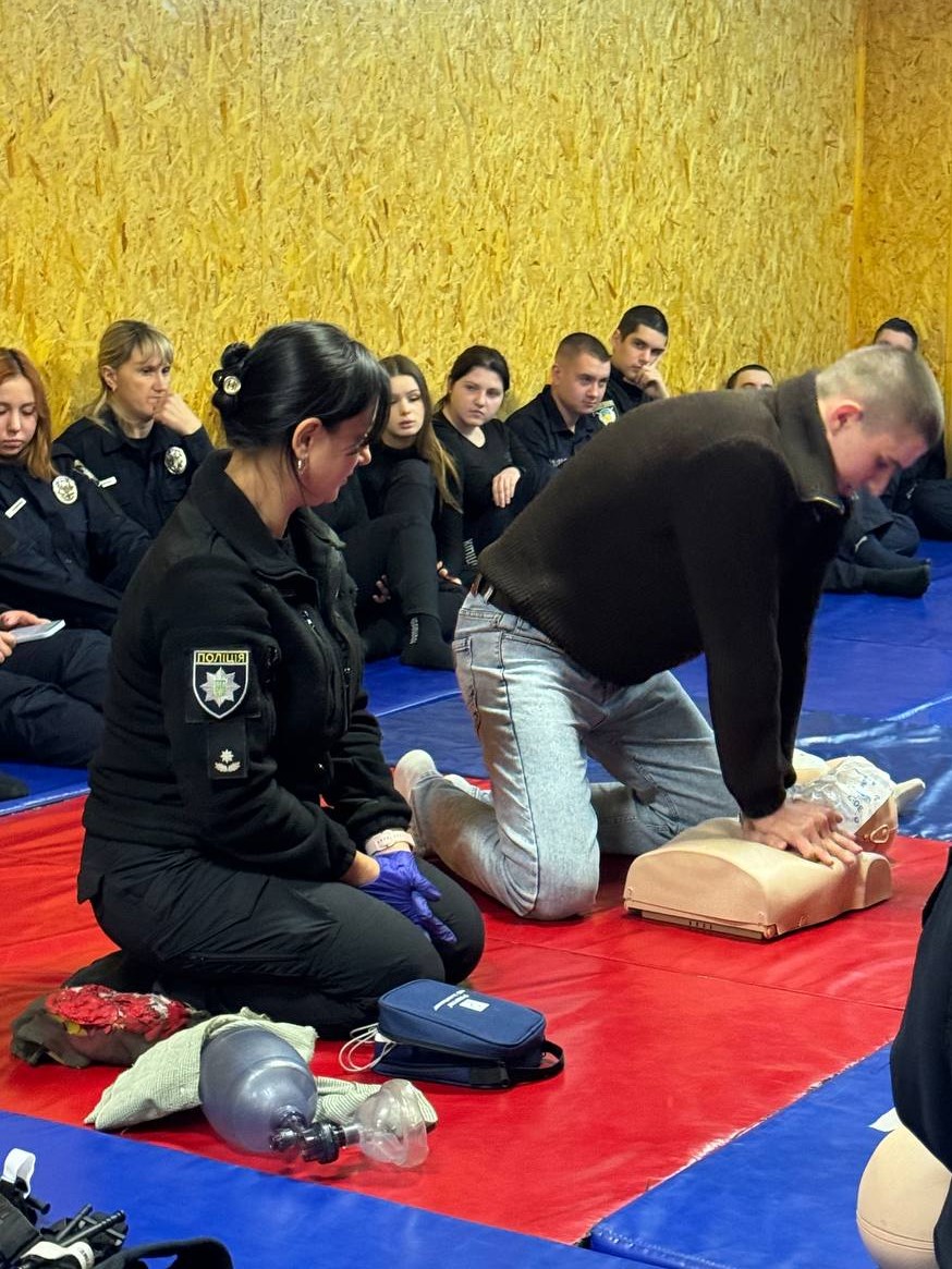 Далі майор поліції Інна Дідиченко провела заняття з домедичної підготовки. Студентів ознайомили з основами надання першої допомоги, включаючи техніки зупинки кровотечі, серцево-легеневої реанімації та інших важливих процедур, які можуть врятувати життя.