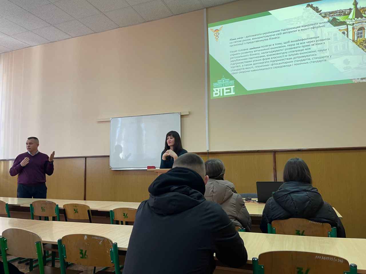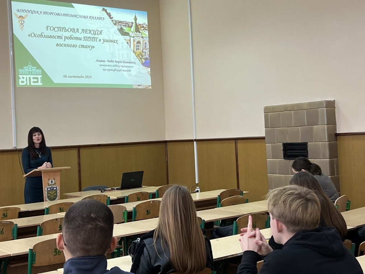 6 листопада 2024 року відбулась гостьова лекція для здобувачів вищої освіти груп ПТ-11д(м), ПТ-11д, ПТБД-31д на тему «Особливості роботи ТПП в умовах воєнного стану». Доповідачем на лекції виступила начальник відділу експертизи та сертифікації товарів Вінницької торгово-промислової палати Марія Бабій.