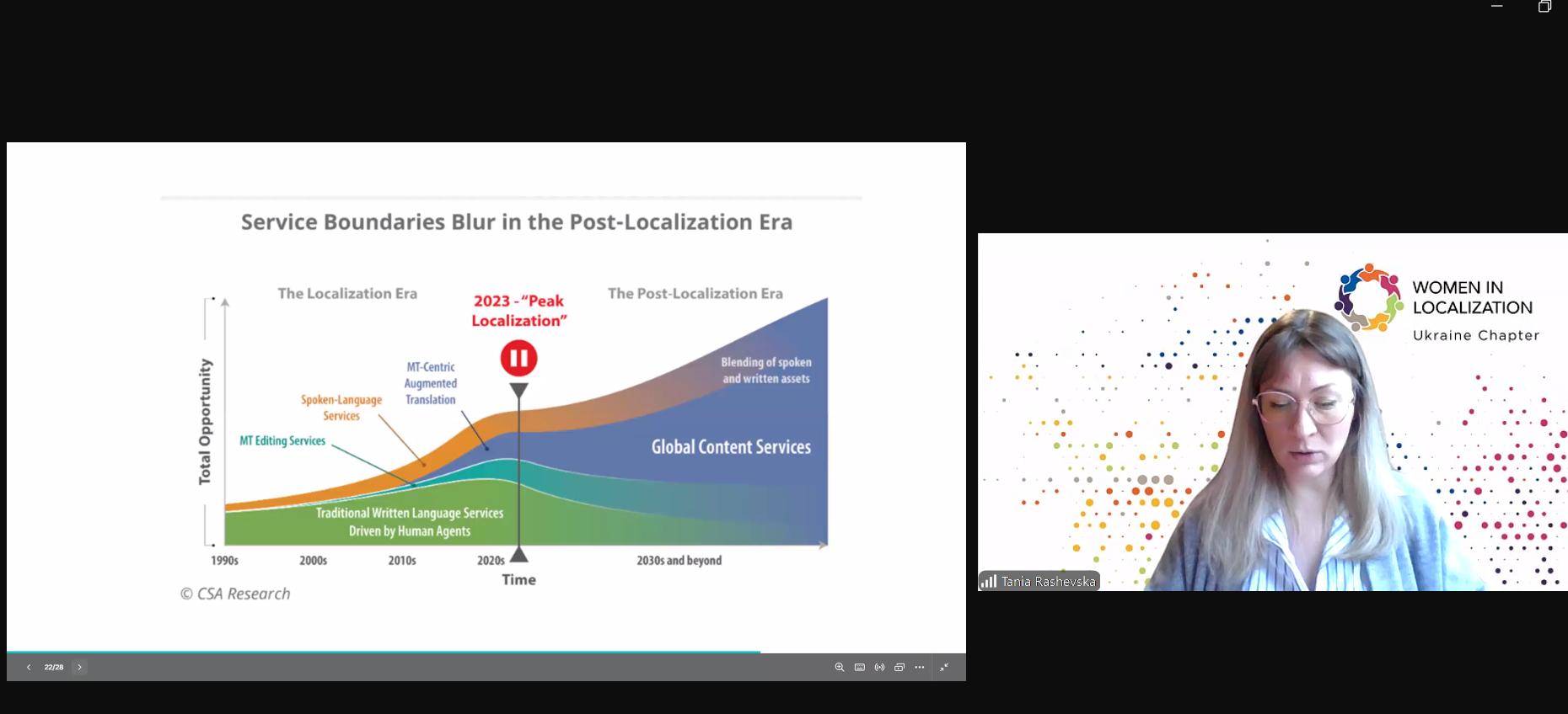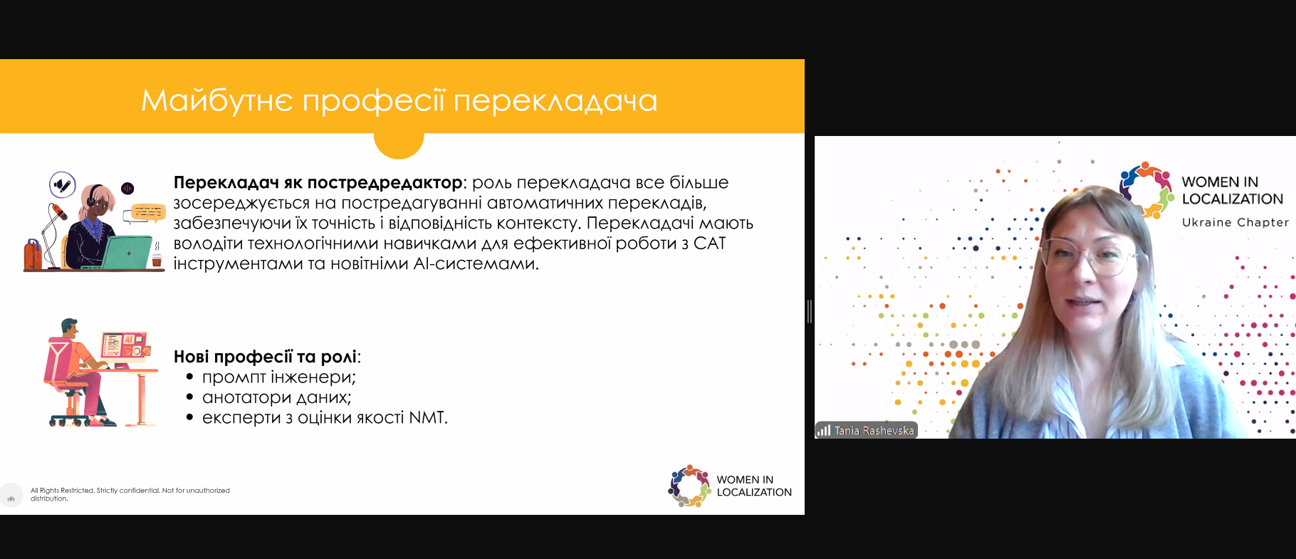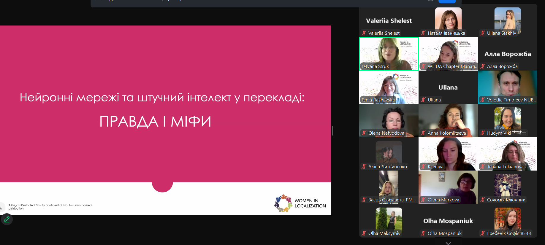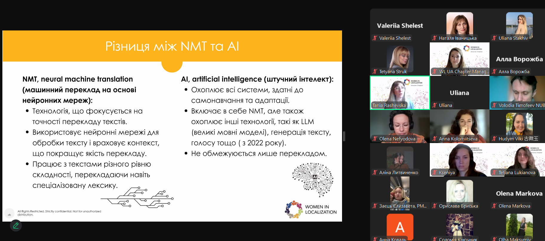 Вебінар був організований професійною спільнотою «Women in Localization Ukraine». Захід був присвячений сучасним технологіям у сфері перекладу, зокрема використанню нейромереж для машинного перекладу (NMT) та їхнього впливу на професійну діяльність перекладачів. Учасники ознайомилися з актуальними трендами у сфері локалізації, обговорили можливості та виклики, які виникають у зв’язку з інтеграцією штучного інтелекту в перекладацьку практику, а також перспективи розвитку галузі.