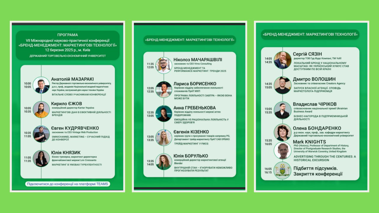12 березня 2025 року на базі Державного торговельно-економічного університету відбулася VII Міжнародна науково-практична конференція «Бренд-менеджмент: маркетингові технології». Захід проходив на платформі Teams і зібрав понад 600 науковців і практиків у сфері бренд-менеджменту.