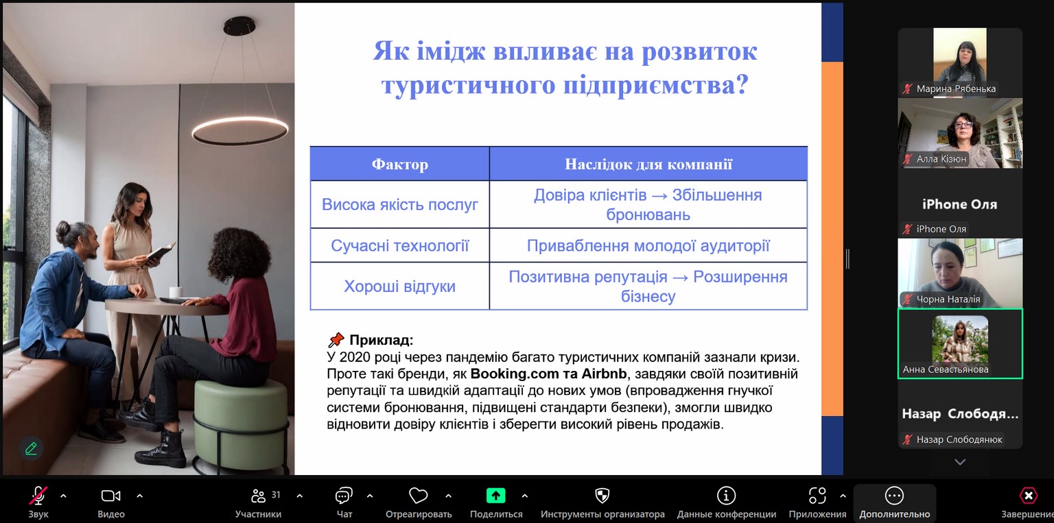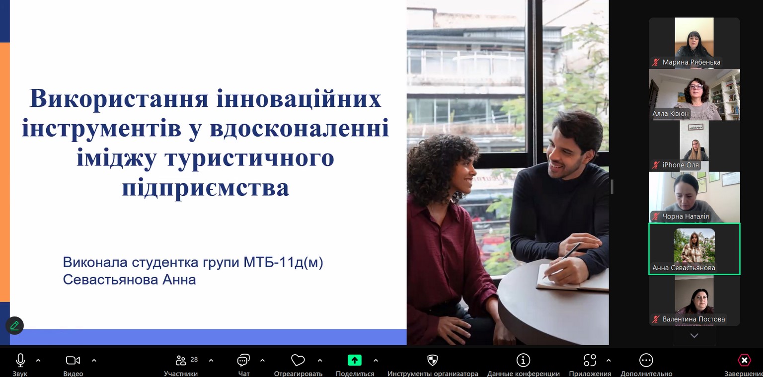 Севастьянова Анна, здобувач вищої освіти ОС «магістр» ОП «Міжнародний туристичний бізнес» групи МТБ-11д(м) з доповіддю «Використання інноваційних інструментів у вдосконаленні іміджу туристичного підприємства»;