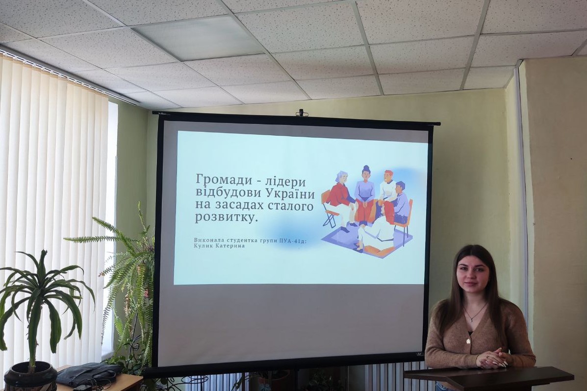 2. «Громади-лідери відбудови України на засадах сталого розвитку» – доповідачка Катерина Кулик (гр. ПУА-41д);